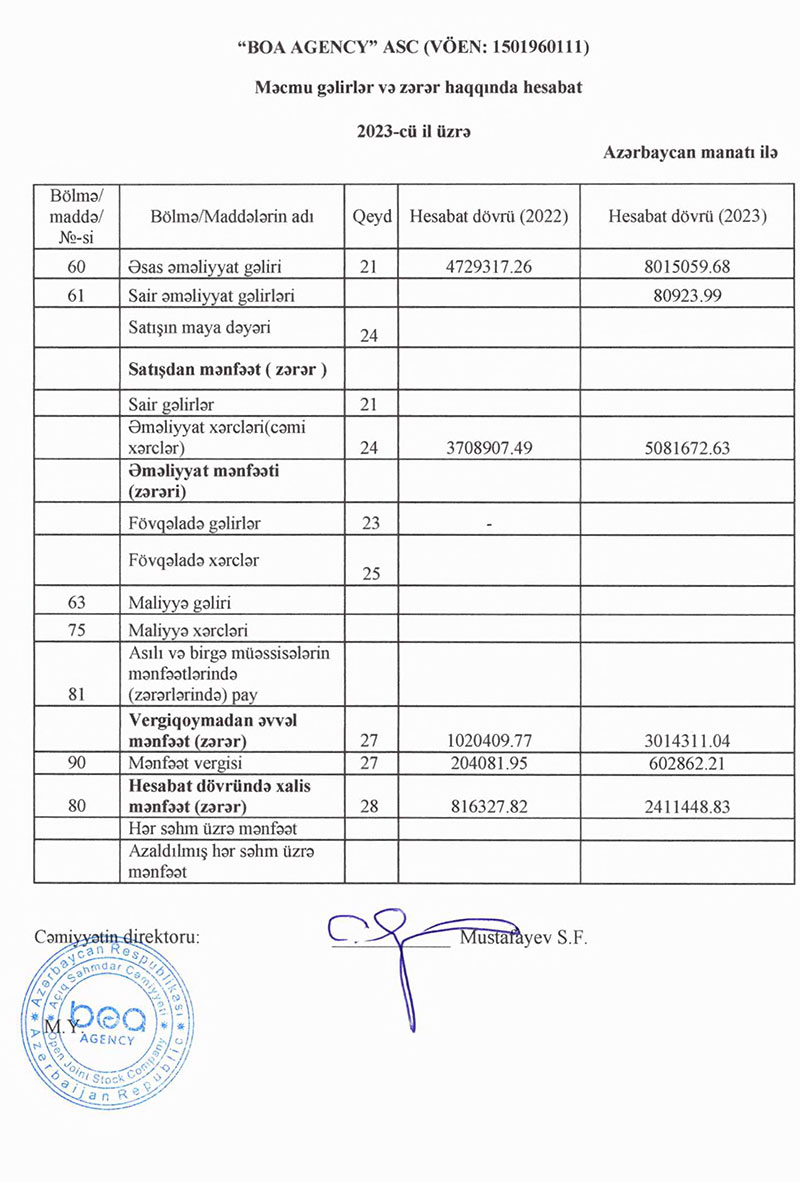 "BOA Agency" ASC-nin əsas əməliyyat gəlirləri 2022-ci ildə 4 milyon 729 min manat ikən, 2023-cü ildə 1,8 dəfə artaraq 8 milyon 15 min manat təşkil edib.