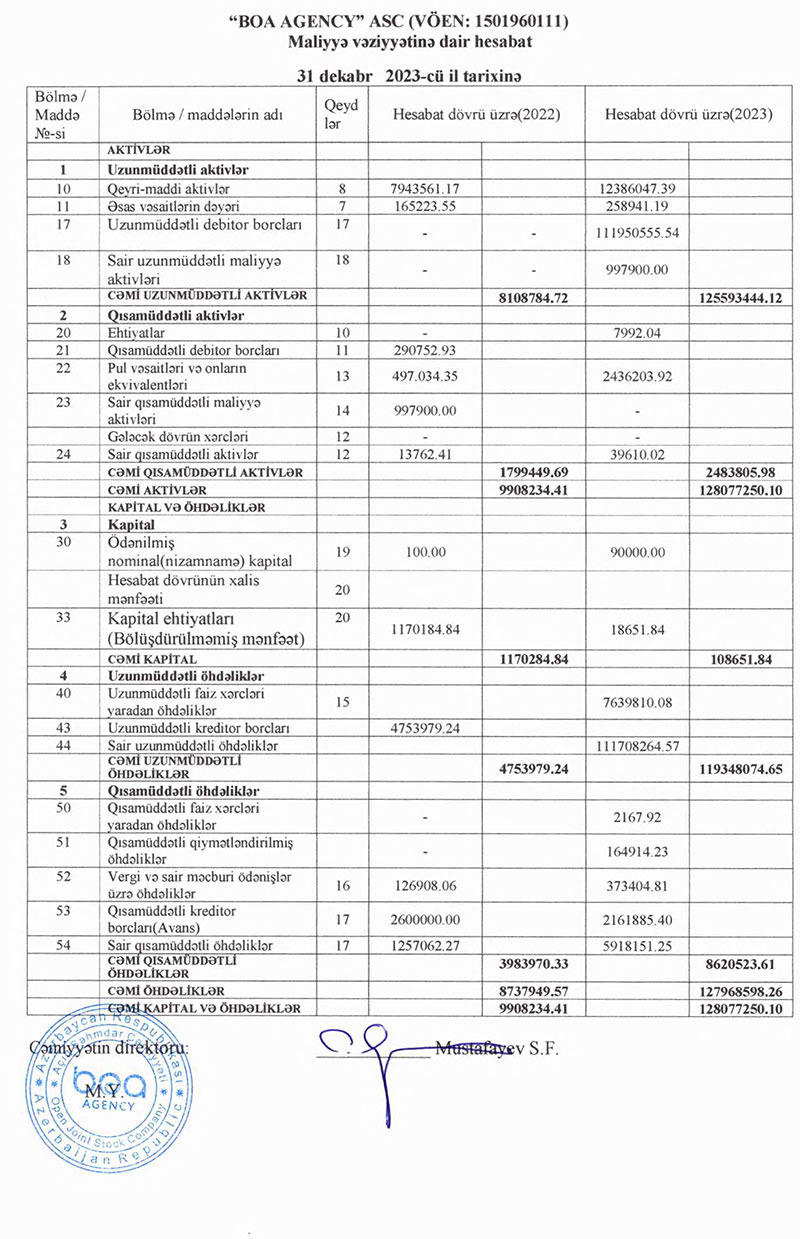 Borcların yığılması üzrə xidmətlər göstərən "BOA Agency" ASC 2023-cü ili 2 milyon 411 min manat xalis mənfəət ilə başa vurub. Şirkət 2022-ci ili 816 min manat xalis mənfəət ilə bağlamışdı. Beləliklə, "BOA Agency"nin xalis mənfəəti 2023-cü ildə 2022-ci illə müqayisədə 3 dəfəyə yaxın artıb.