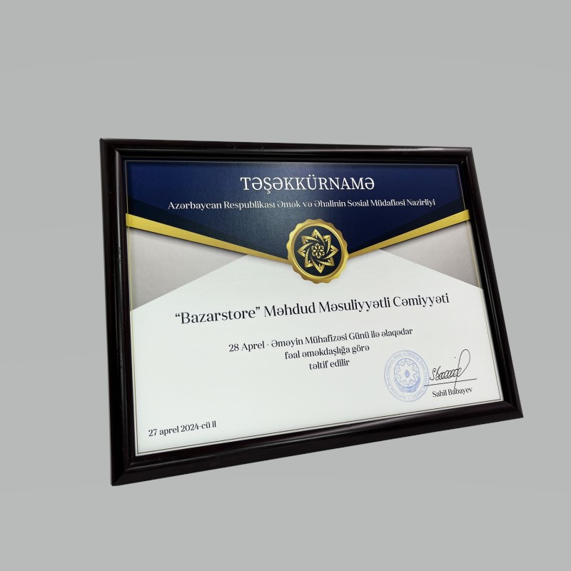 (®) Bazarstore - Əməyin Mühafizəsi Günü ilə əlaqədar fəal əməkdaşlığa görə təltif edildi