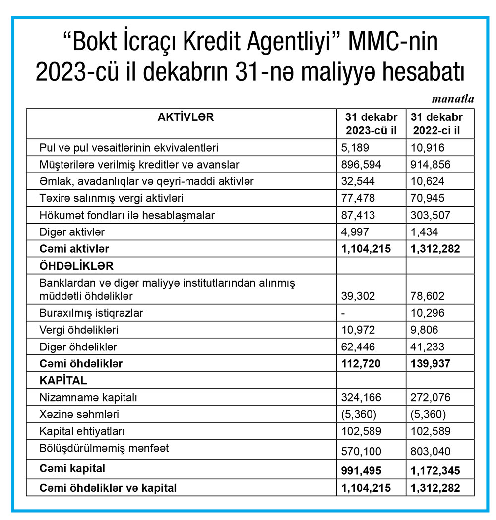 2023-cü ildə “BOKT İcraçı Kredit Agentliyi” MMC-nin kredit portfeli (müştərilərə verilmiş kreditlər) 18 min 262 manat azalaraq 896 min 594 manata düşüb. Təşkilat 2022-ci ilin sonunda 914 min 856 manat kredit portfelinə malik idi.