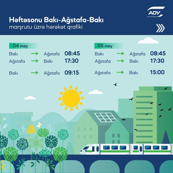 Azərbaycan Dəmir Yolları (ADY) həftəsonu artan sərnişin tələbatını təmin etmək üçün Bakı-Ağstafa-Bakı marşrutu üzrə əlavə qatar təyin edir.