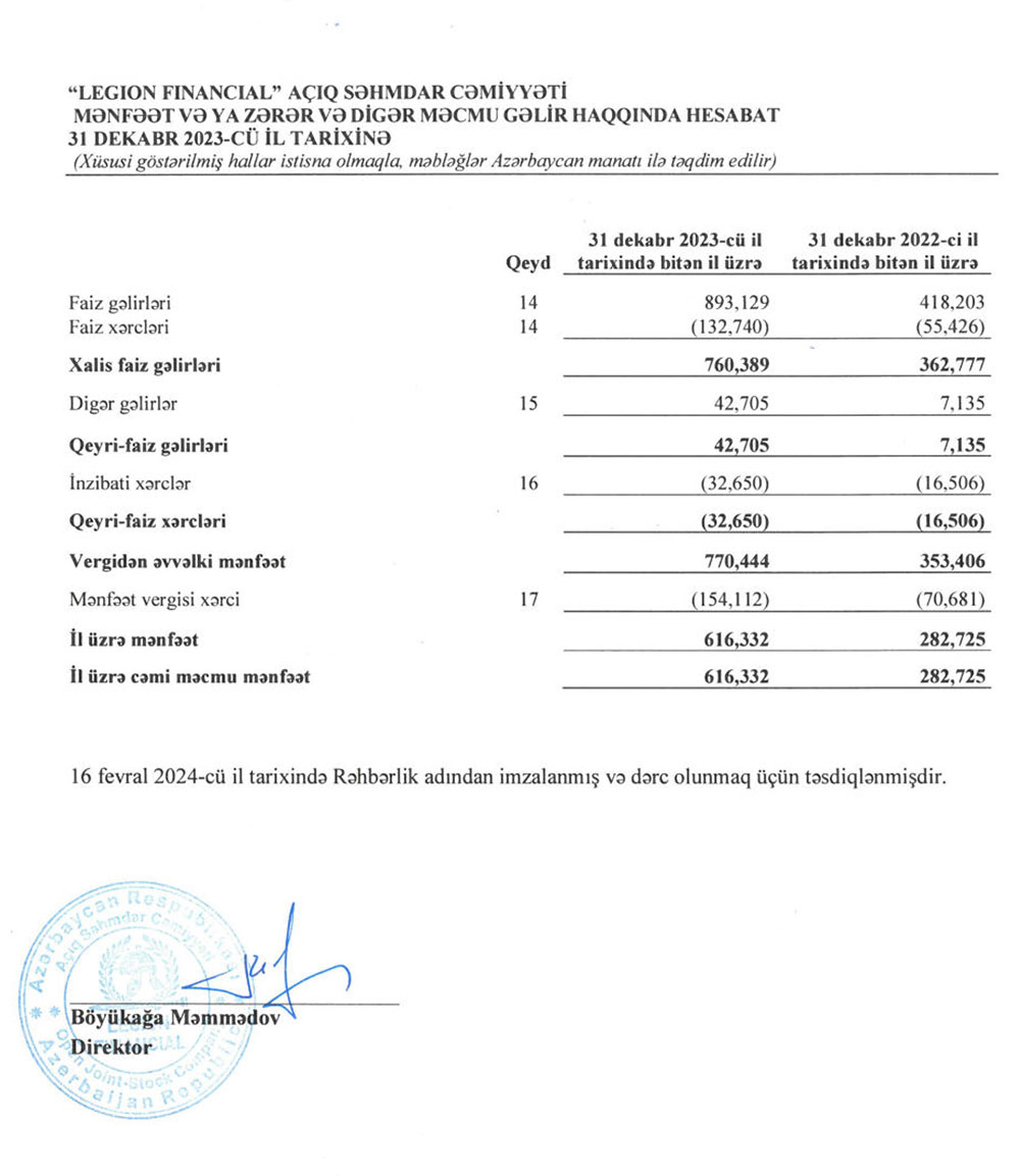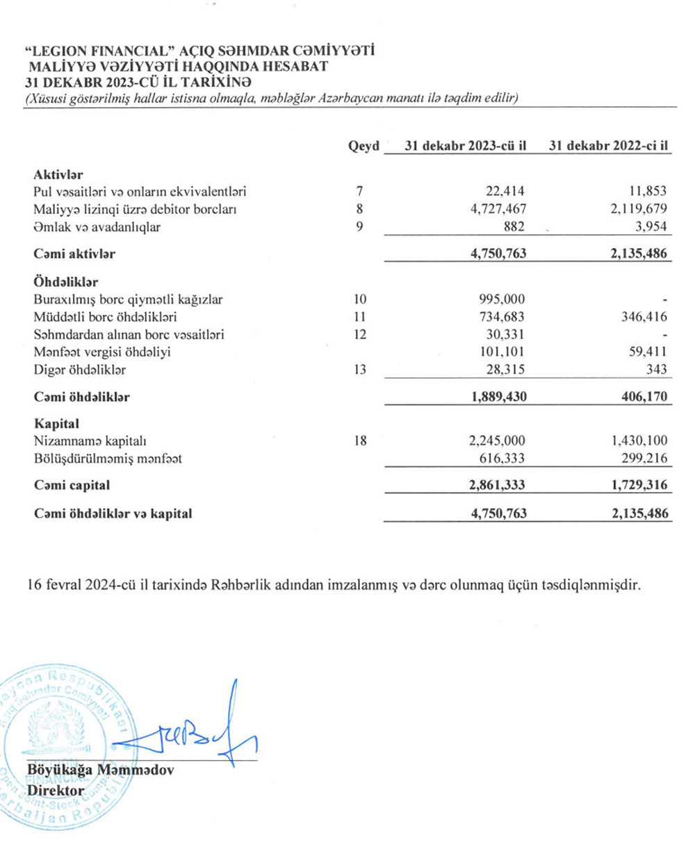 Lizinq şirkəti "Legion Financial" ASC 2023-cü ili 616 min manat xalis mənfəət ilə başa vurub ki, bu da 2022-ci illə müqayisədə 2,2 dəfə çoxdur. Lizinq şirkəti 2022-ci ili 283 min manat xalis mənfəət ilə bağlamışdı.