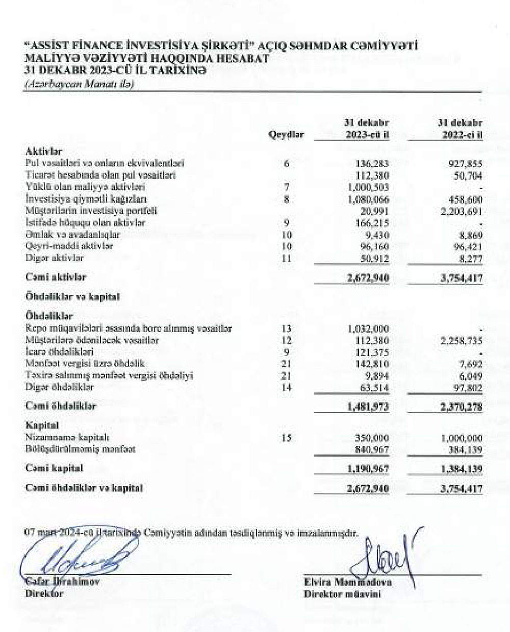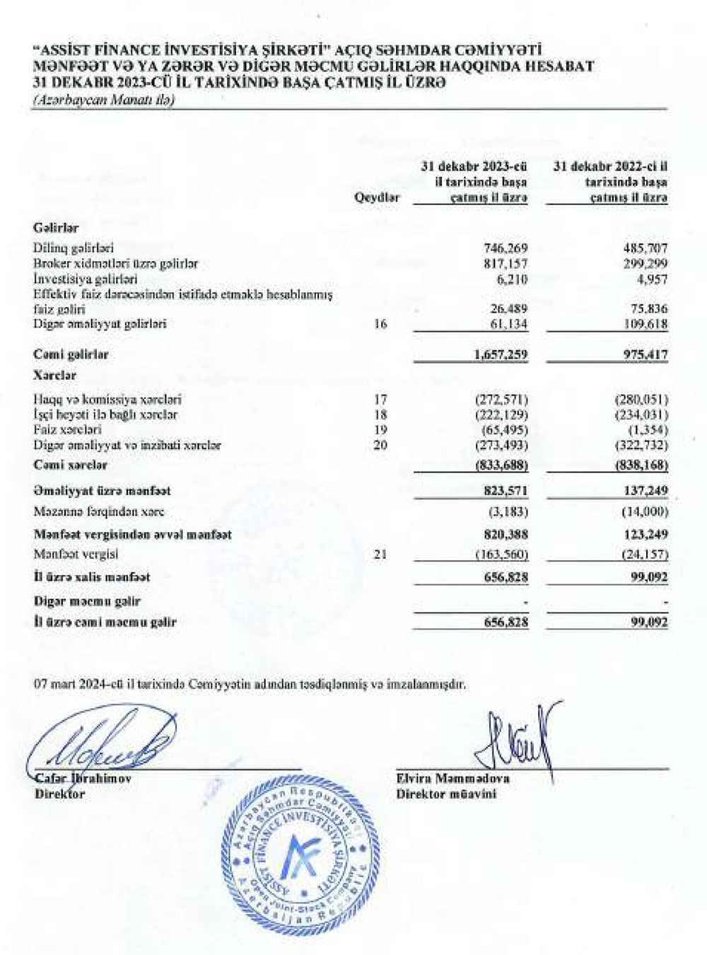 Marja.az Şirkətin illik hesabatına istinadən xəbər verir ki, “Assist Finance İnvestisiya Şirkəti"nin cəmi gəlirləri 2022-ci ildə 975 min manat ikən, 2023-cü ildə 1 milyon 657 min manata yüksəlib (682 min manat və ya 70% artıb).