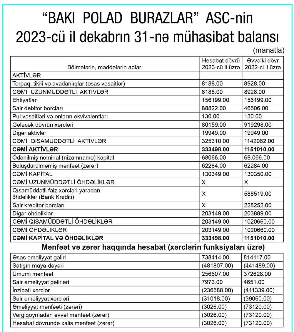 “Bakı Polad Burazlar” ASC 2023-cü ili 3 min 26 manat xalis zərər ilə başa vurub. Şirkət 2022-ci ili 73 min 120 manat xalis zərər ilə bağlamışdı. Beləliklə, “Bakı Polad Burazlar”ın xalis zərəri 2023-cü ildə 2022-ci illə müqayisədə 24 dəfədən çox azalıb.