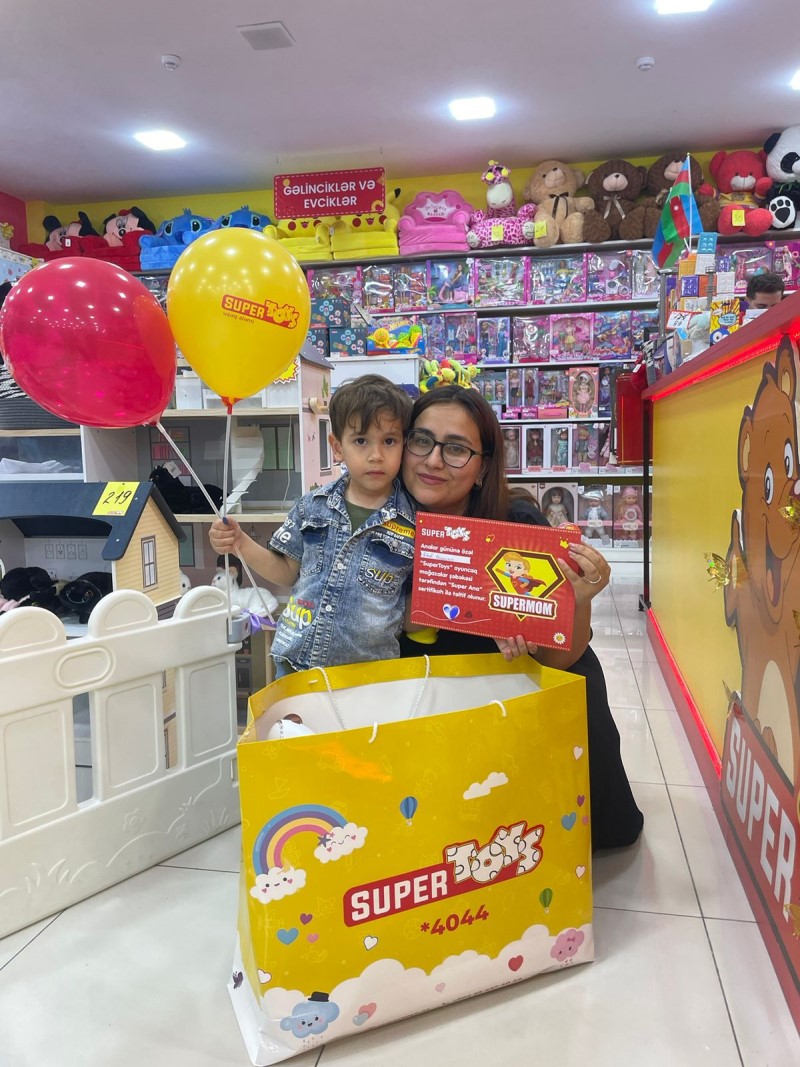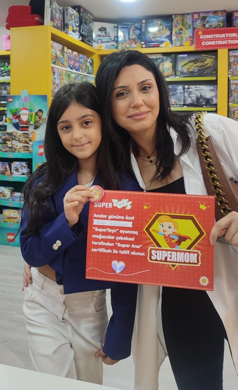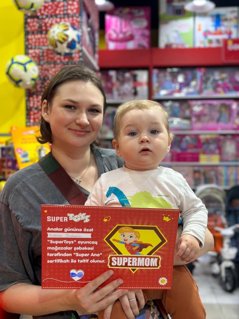 Xüsusi günlərə diqqətlə yanaşan SuperToys ötən gün 12 May Analar Gününə özəl layihə keçirdi. Övladları ilə mağazalarımıza gələn analara bu gündən xatirə qalacaq “Super Ana” sertifikatı verilib. Sertifikata balacanın və ananın barmaq izləri yerləşdirilib. Həmçinin, Super Analarımız “SuperMom” yazılı yaxalıq ilə də təltif olunublar.