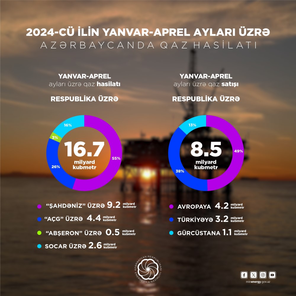 Energetika Nazirliyinin yaydığı məlumata görə, 2024-cü ilin yanvar - aprel ayları üzrə operativ məlumatlara əsasən, 4 ay ərzində respublikada 16,7 milyard kubmetr təbii qaz hasil edilib. Qazın 4,4 milyard kubmetri “Azəri-Çıraq-Günəşli”, 9,2 milyard kubmetri “Şahdəniz”, 0,5 milyard kubmetri “Abşeron”, 2,6 milyard kubmetri SOCAR üzrə hasil olunub. Ötən ilin müvafiq dövrünə nisbətən 0,5 milyard kubmetr artımla qaz hasil edilib.