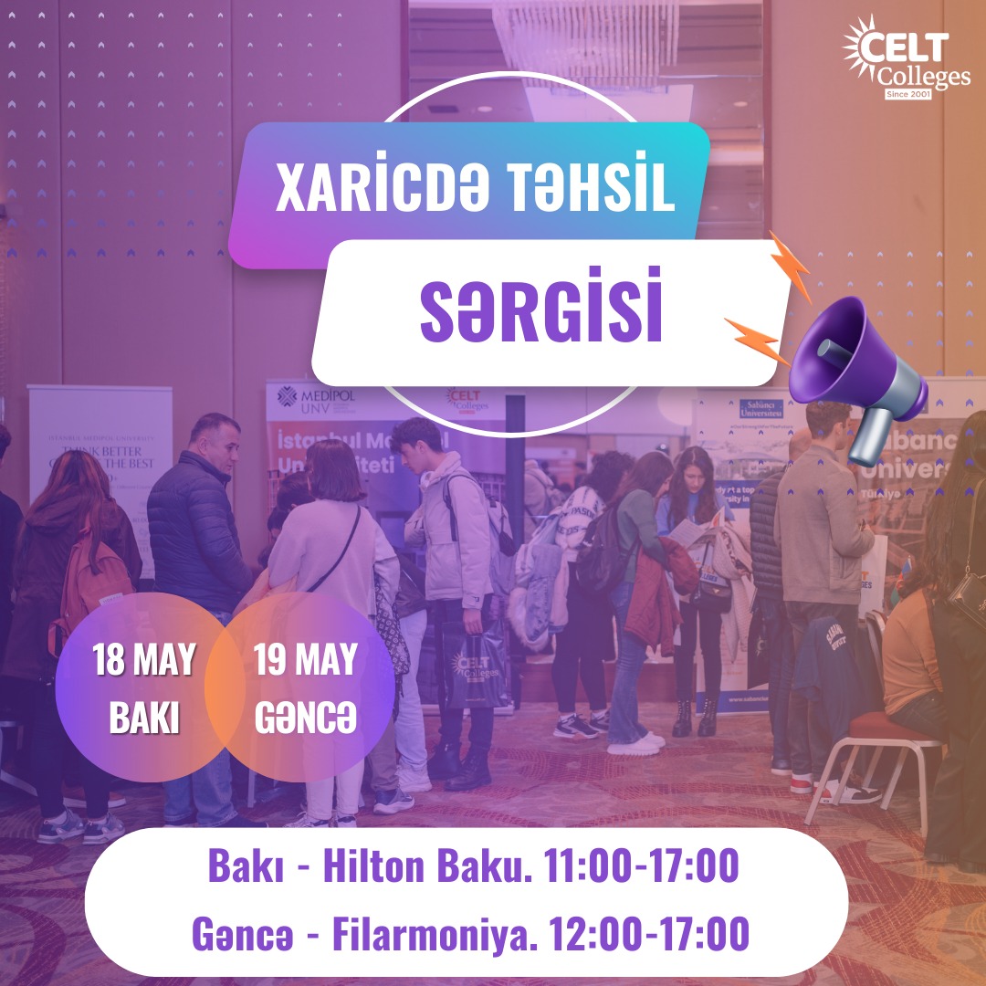 Sərgiyə giriş ödənişsizdir!18-19 May tarixlərində CELT Xaricdə Təhsil Sərgisi keçiriləcək. Sərgidə Avropa, ABŞ, BƏƏ və Türkiyənin 50-dən çox ən reytinqli universitetlərinin qəbul şöbələrinin rəhbərləri və əməkdaşları iştirak edəcək. Sərgidə həmçinin ADA universiteti də iştirak edəcək.