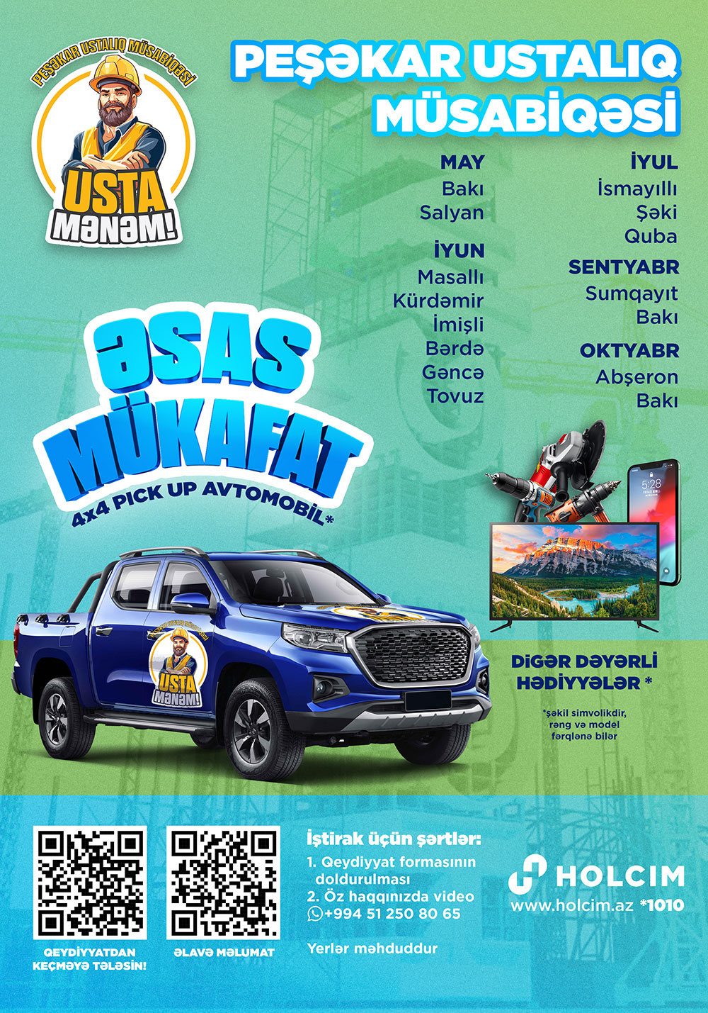 Holcim hər kəsi bu maraqlı müsabiqədə iştirak etməyə dəvət edir, çünki Usta Sənsən! raflı məlumat üçün www.holcim.az saytına daxil olun və ya *1010 nömrəsi ilə təşkilatçılarla əlaqə saxlayın.