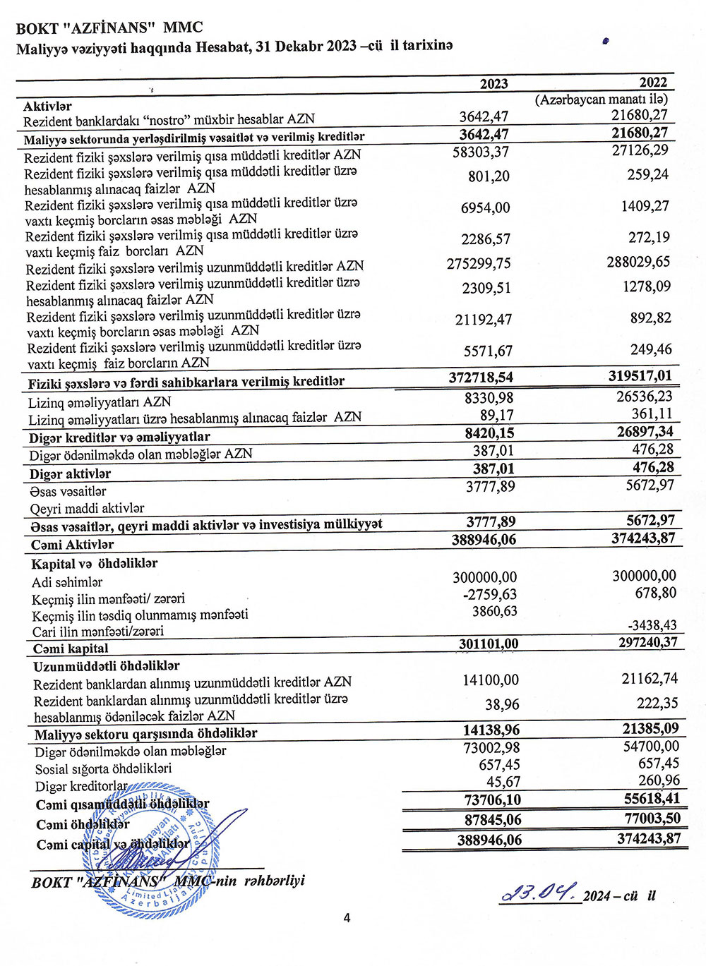 BOKT "AzFinans" MMC 2023-cü ili 1894 manat xalis mənfəət ilə başa vurub. Təşkilat 2022-ci ili 3 min 438 manat xalis zərər ilə bağlamışdı.