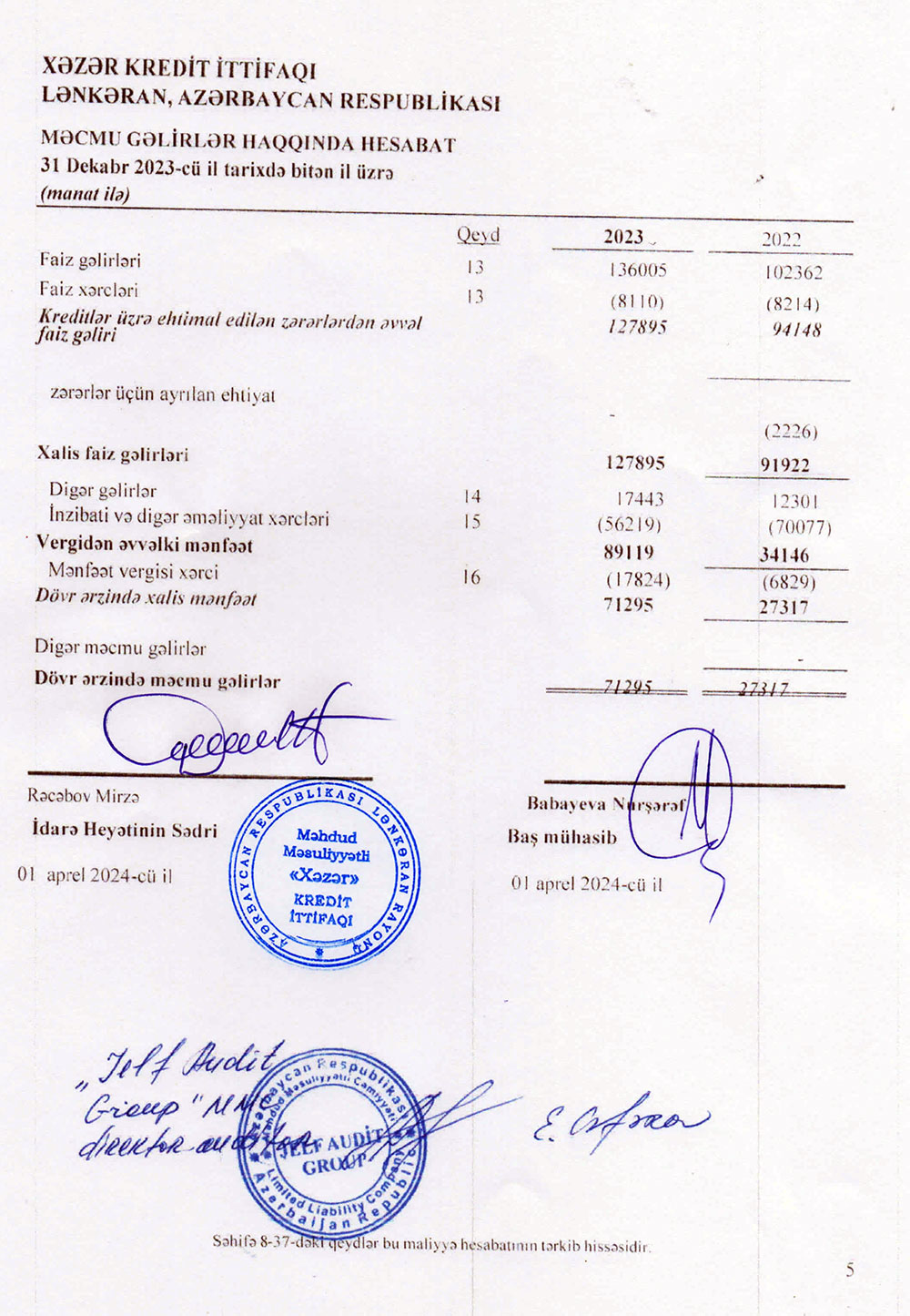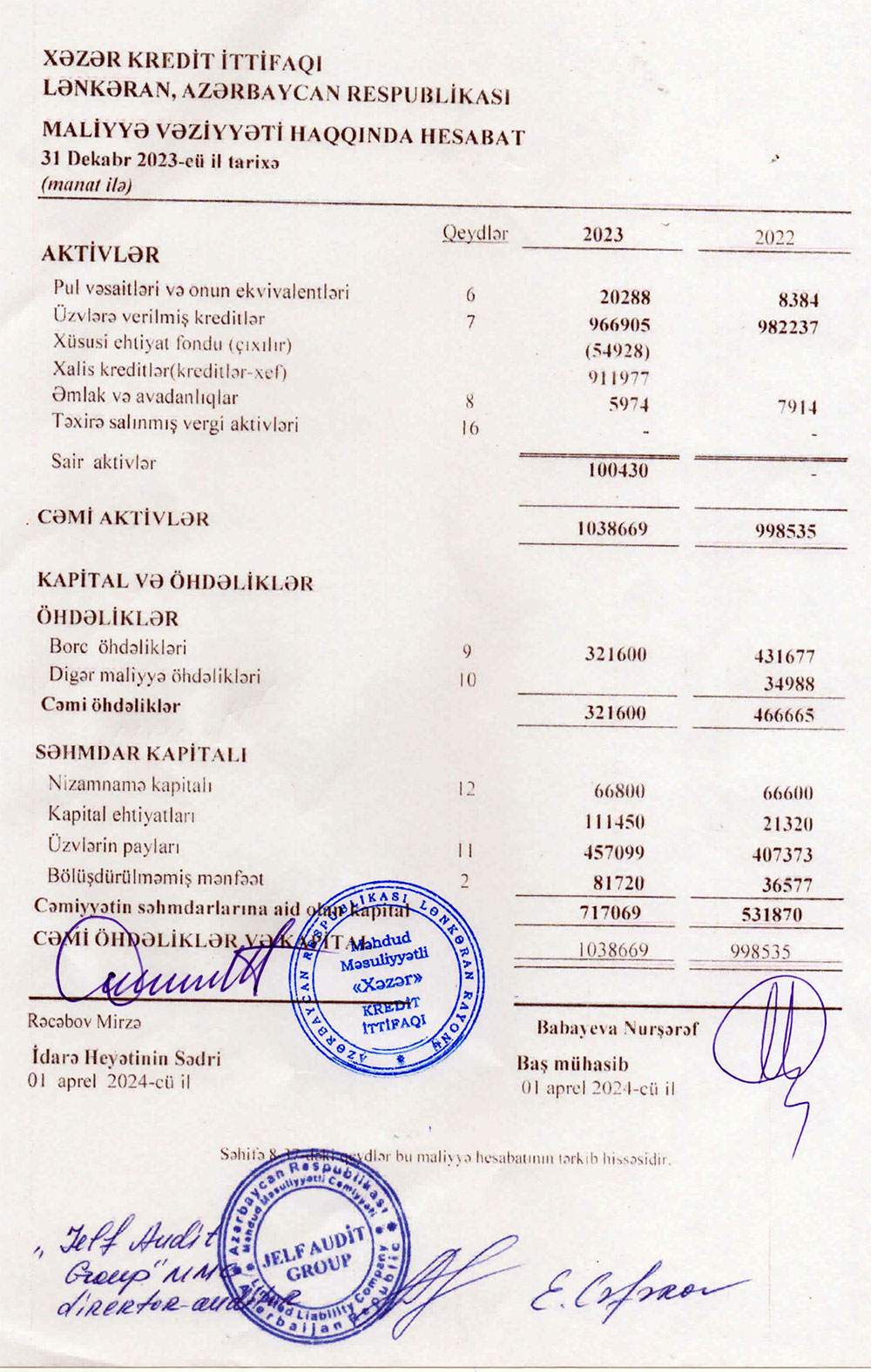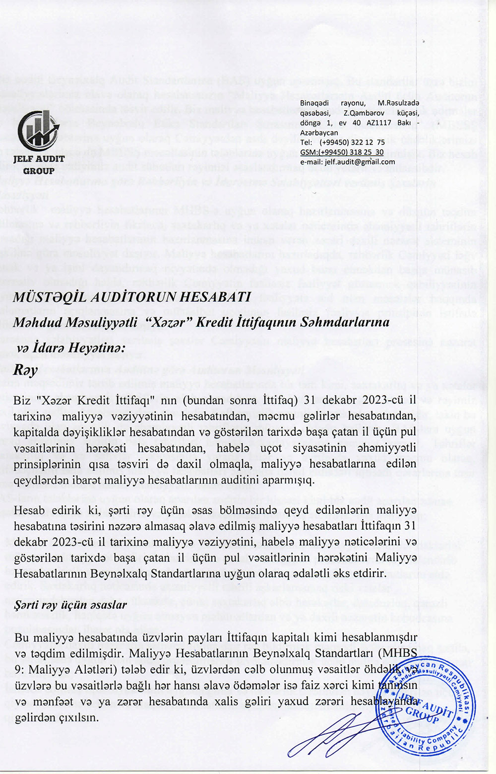 "Xəzər Kredit İttifaqı" MMC-nin 31 dekabr 2023-xü il tarixində bitən il üzrə maliyyə hesabatları.