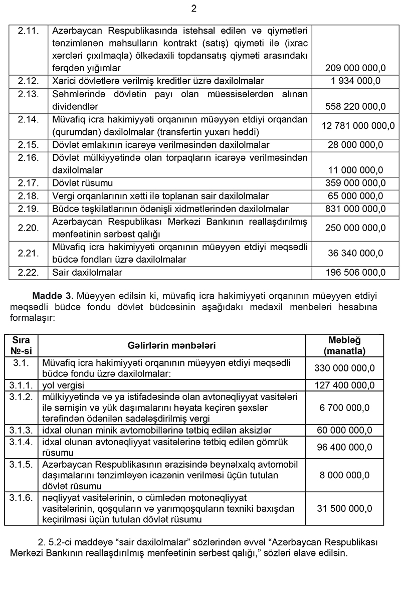 Mövcud daxilolma mənbələrindən əlavə olaraq dövlət büdcəsinə Azərbaycan Respublikası Mərkəzi Bankının reallaşdırılmış mənfəətinin sərbəst qalığından 250 milyon manat, “Nəqliyyat vasitələrinin utilizasiyası Fondu”na (məqsədli büdcə fondu) isə 25 milyon manat səviyyəsində daxilolma proqnozlaşdırılır.