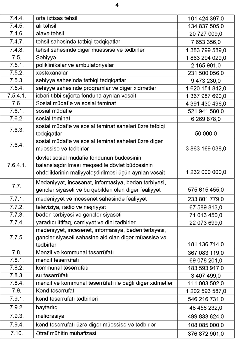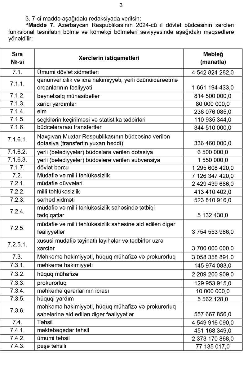 Yenidən baxılma ilə 2024-cü il dövlət büdcəsinin xərcləri funksional təsnifata uyğun olaraq iqtisadi fəaliyyət (dövlət əsaslı vəsait qoyuluşu,işğaldan azad olunmuş ərazilərin yenidən qurulması, bərpası və digər xərclər) xərcləri təsdiq olunmuş 7 milyard 788 milyon manata qarşı 9 milyard 902,7 milyon manat və ya 2 milyard 114,7 milyon manat (27,2 faiz), müdafiə və milli təhlükəsizlik xərcləri təsdiq olunmuş 6 milyard 421 milyon manata qarşı 7 milyard 126,3 milyon manat və ya 705,3 milyon manat (11 faiz), əsas bölmələrə aid edilməyən xidmətlər üzrə xərclər təsdiq olunmuş 1 milyard 390,3 milyon manata qarşı 1 milyard 750,2 milyon manat və ya 359,9 milyon manat (25,9 faiz), məhkəmə hakimiyyəti, hüquq mühafizə və prokurorluq xərcləri təsdiq olunmuş 2 milyard 956,7 milyon manata qarşı 3 milyard 58,4 milyon manat və ya 101,7 milyon manat (3,4 faiz), kənd təsərrüfatı xərcləri təsdiq olunmuş 1 milyard 102,6 milyon manata qarşı 1 milyard 202,6 milyon manat və ya 100 milyon manat (9,1 faiz), mədəniyyət, incəsənət, informasiya, bədən tərbiyəsi, gənclər siyasəti və bu qəbildən olan digər fəaliyyət xərcləri təsdiq olunmuş 574,8 milyon manata qarşı 575,6 milyon manat və ya 0,9 milyon manat (0,1 faiz) çox, ümumi dövlət xidmətləri (qanunvericilik və icra hakimiyyəti, beynəlxalq münasibətlər, xarici ölkələrə yardımlar, büdcələrarası transfertlər, dövlət borcu) xərcləri təsdiq olunmuş 4 milyard 822,2 milyon manata qarşı 4 milyard 542,8 milyon manat və ya 279,4 milyon manat (5,8 faiz), səhiyyə xərcləri təsdiq olunmuş 1 milyard 871,3 milyon manata qarşı 1 milyard 863,3 milyon manat və ya 8,0 milyon manat (0,4 faiz), sosial müdafiə və sosial təminat xərcləri təsdiq olunmuş 4 milyard 542,2 milyon manata qarşı 4 milyard 391,4 milyon manat və ya 150,8 milyon manat (3,3 faiz) az, təhsil xərcləri, mənzil və kommunal təsərrüfatı xərcləri və ətraf mühitin mühafizəsi xərcləri isə təsdiq olunmuş məbləğdə proqnozlaşdırılır.