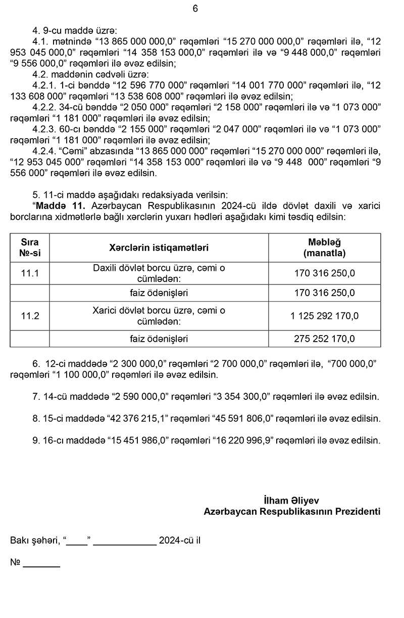 Yenidən baxılma ilə 2024-cü ilin dövlət büdcəsinin kəsiri 764,3 milyon manat məbləğində böyüdülməklə 3 milyard 354,3 milyon manata çatdırılır. Kəsirin artımının 600 milyon manatı daxili borclanmadan cəlb olunan vəsait, 105,9 milyon manatı vahid xəzinə hesabının sərbəst qalığı və 58,4 milyon manatı Məqsədli Büdcə Fondlarının vəsaitlərinin qalığı hesabına təmin ediləcəkdir. Kəsirin cari ilin sonuna gözlənilən ümumi daxili məhsula nisbəti 2,8 faiz həcmində olacaqdır.