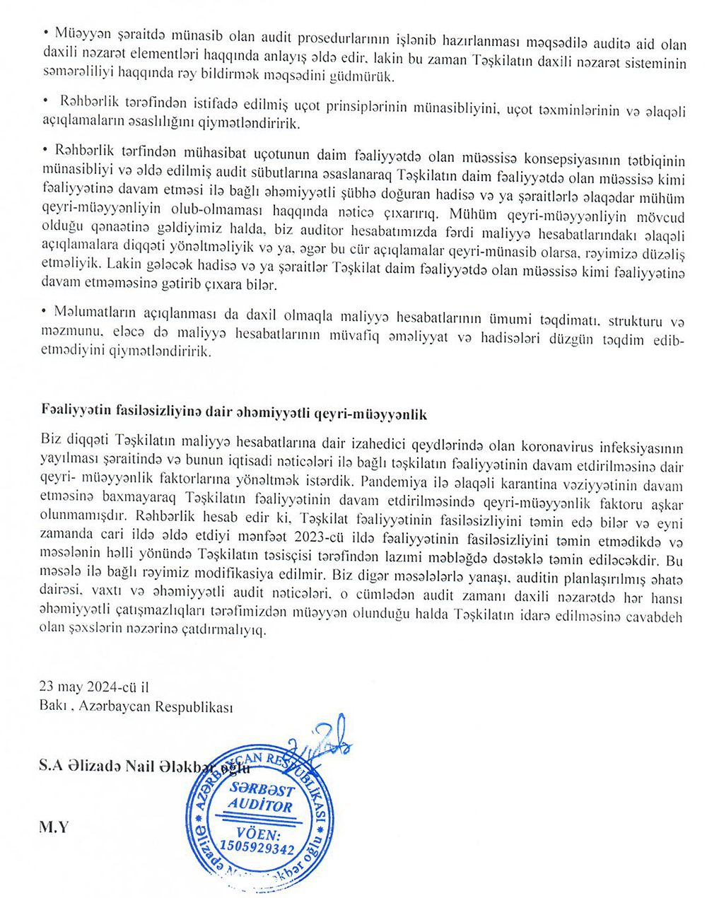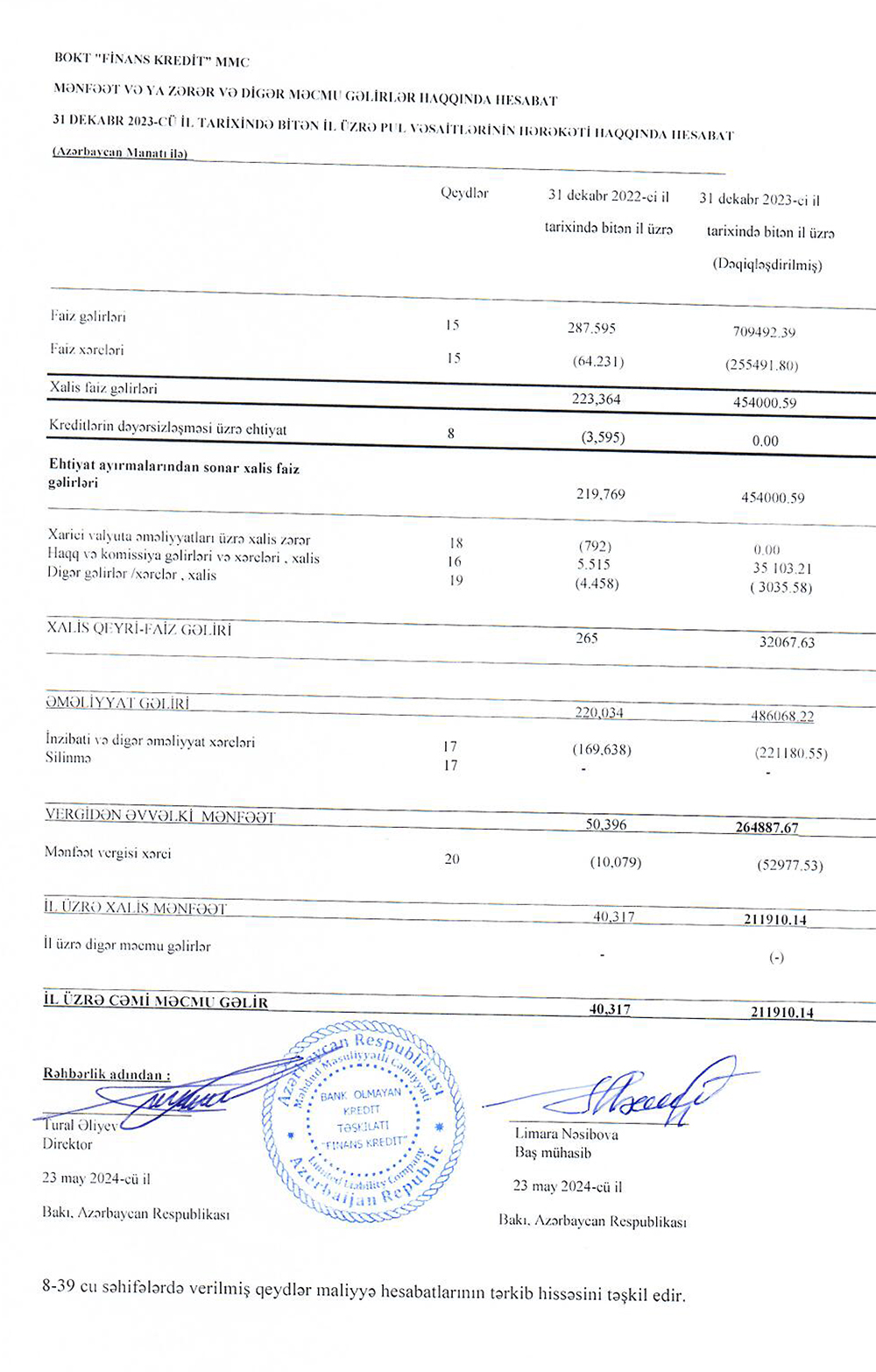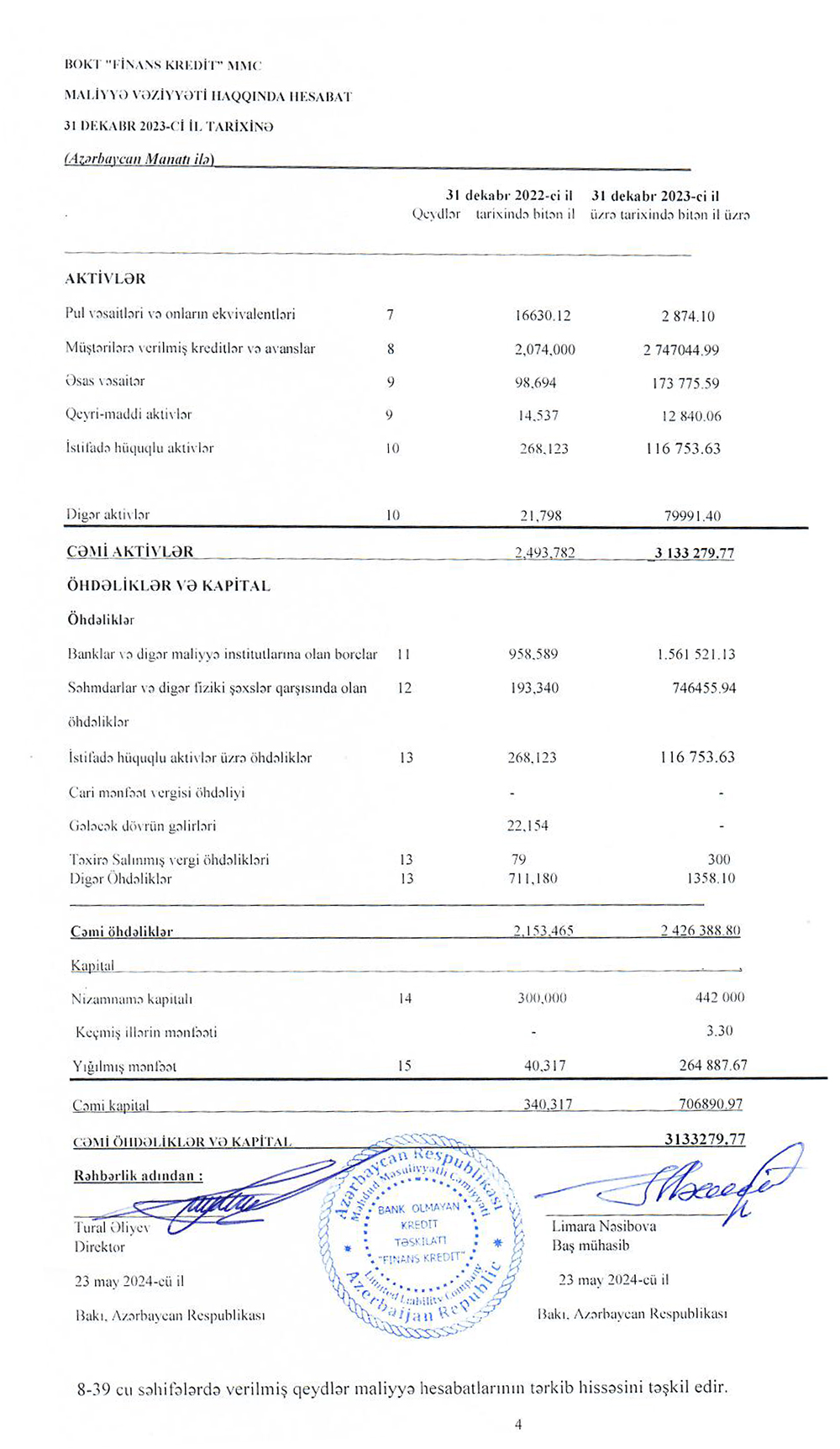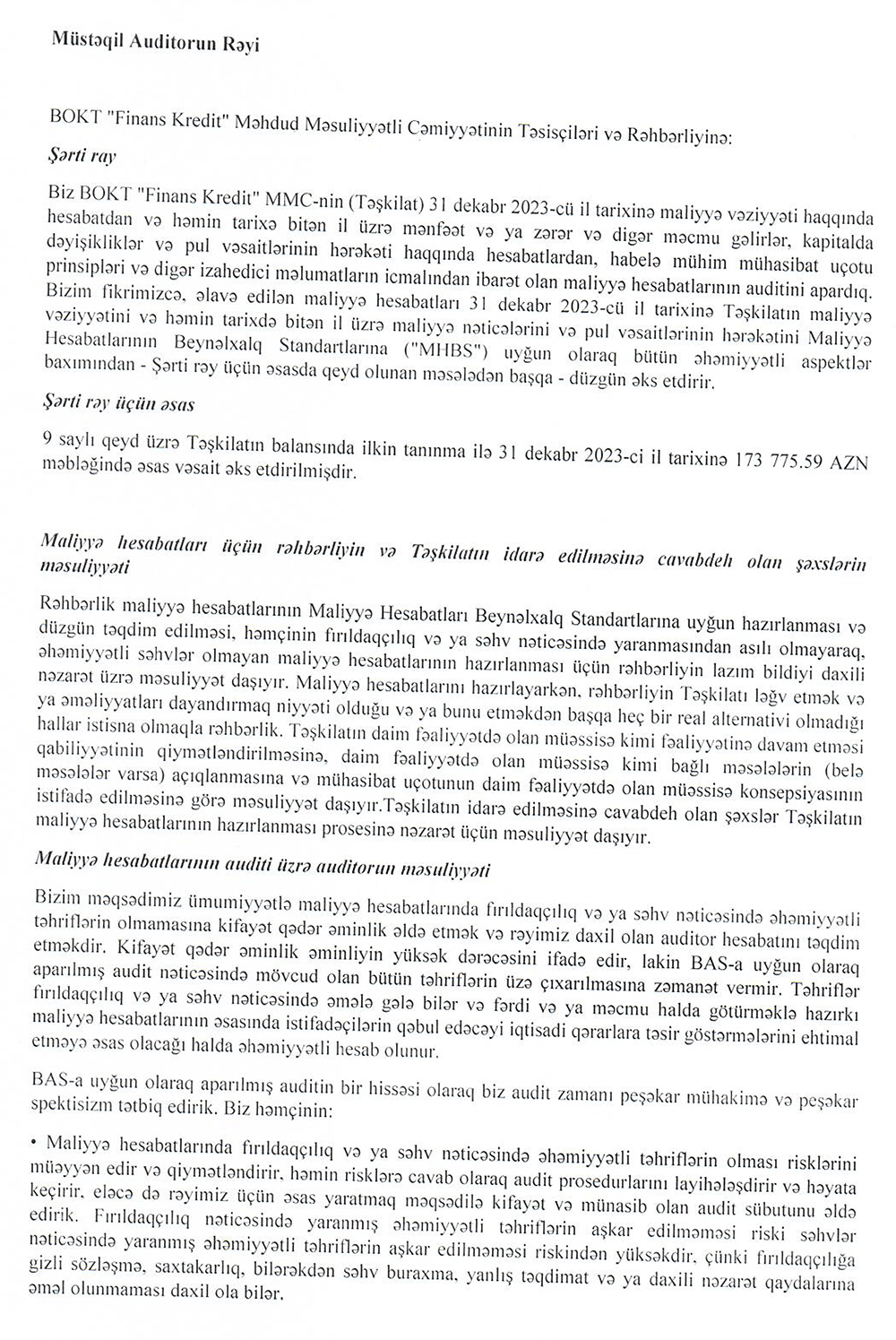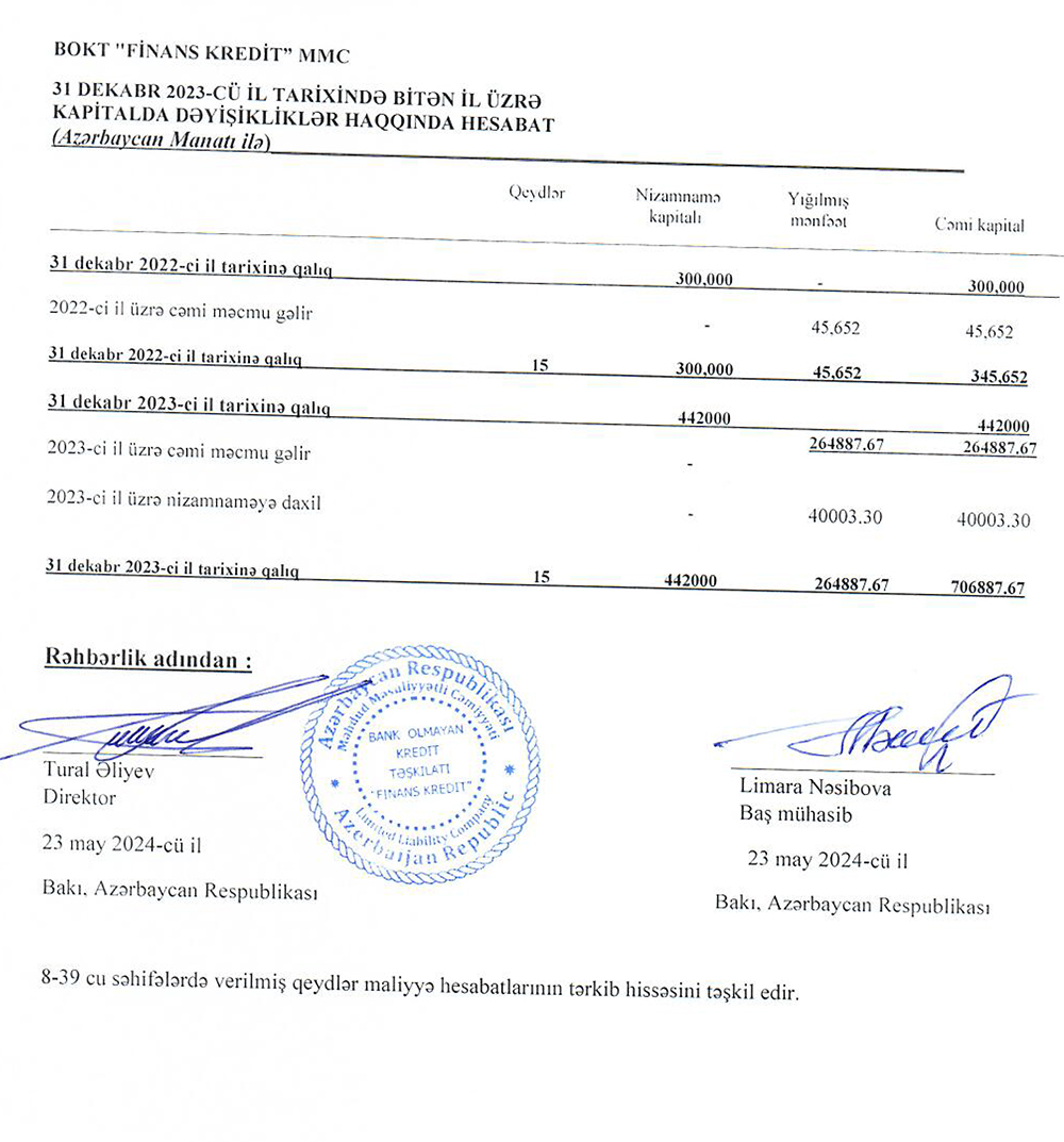 BOKT "Finans Kredit" MMC-nin 31 dekabr 2023-cü il tarixində bitən il üzrə maliyyə hesabatları