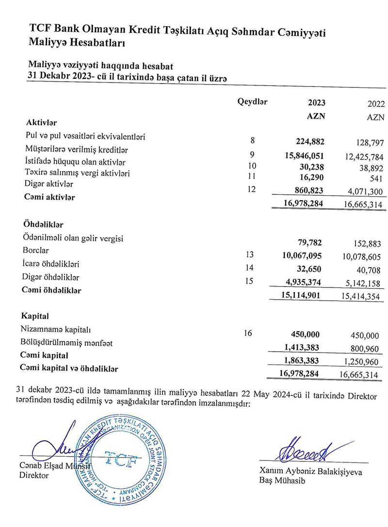 "TCF BOKT"ın kredit portfeli (müştərilərə verilmiş kreditlər) 2023-cü ildə 3 milyon 420 min manat və ay 27,5% artaraq 15 milyon 846 min manata yüksəlib.