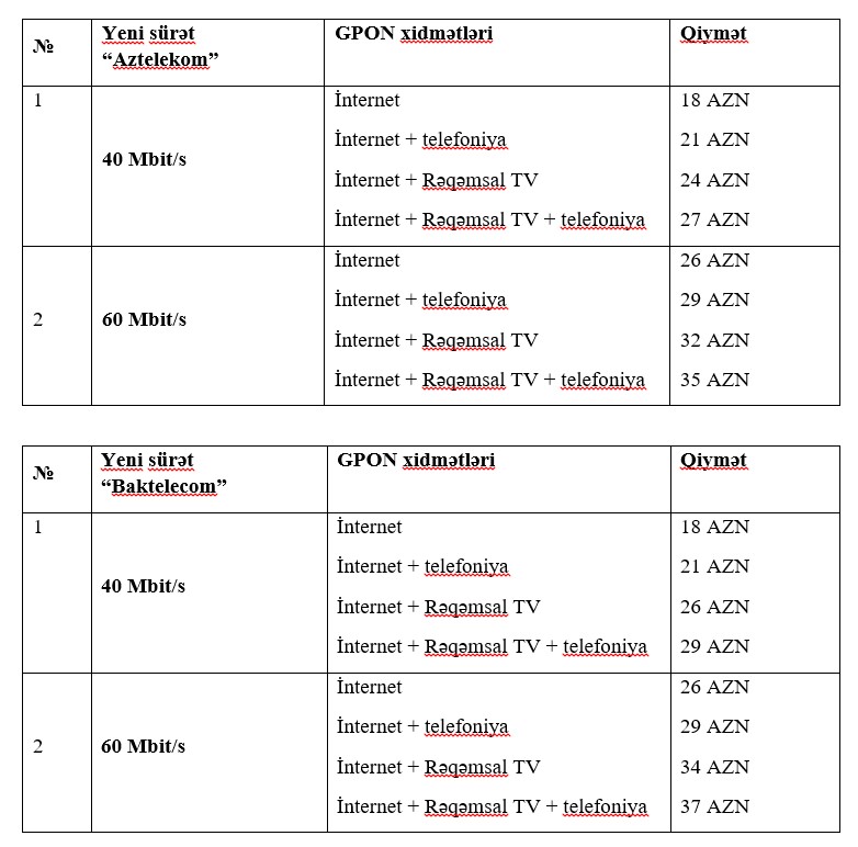 Marja.az şirkətlərə istinadən xəbər verir ki, qurumlar iyunun 1-dən etibarən qiymətləri sabit saxlamaqla GPON (Gigabit Passive Optical Network – Gigabit tutumlu Passiv Optik Şəbəkə) tarifləri üzrə təqdim olunan 30 Mbit/s internet sürətini 40 Mbit/s-ə, 50 Mbit/s internet sürətini isə 60 Mbit/s-ə qədər artıracaq.