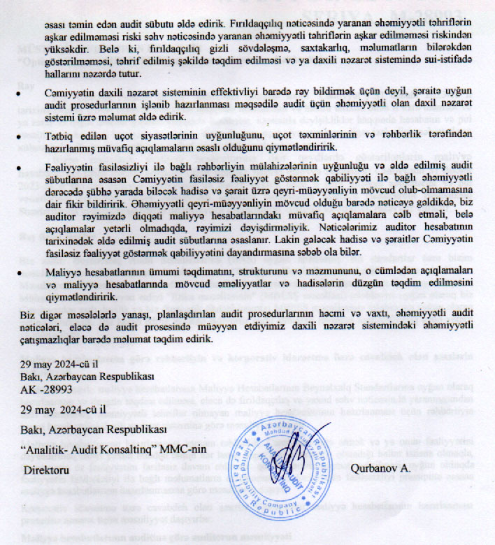 31 dekabr 2023-cü il tarixində bitən il üzrə “Optimal Finance BOKT” MMC-nin maliyyə hesabatları