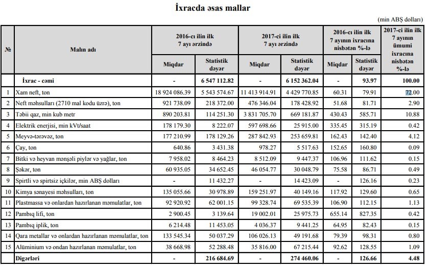 Müqayisə olunan dövrdə ixrac olunmuş xam neftin statistik dəyəri isə 5 milyard 543 milyon 574 min dollardan 4 milyard 429 milyon 770 min dollara düşüb (20% azalıb).
