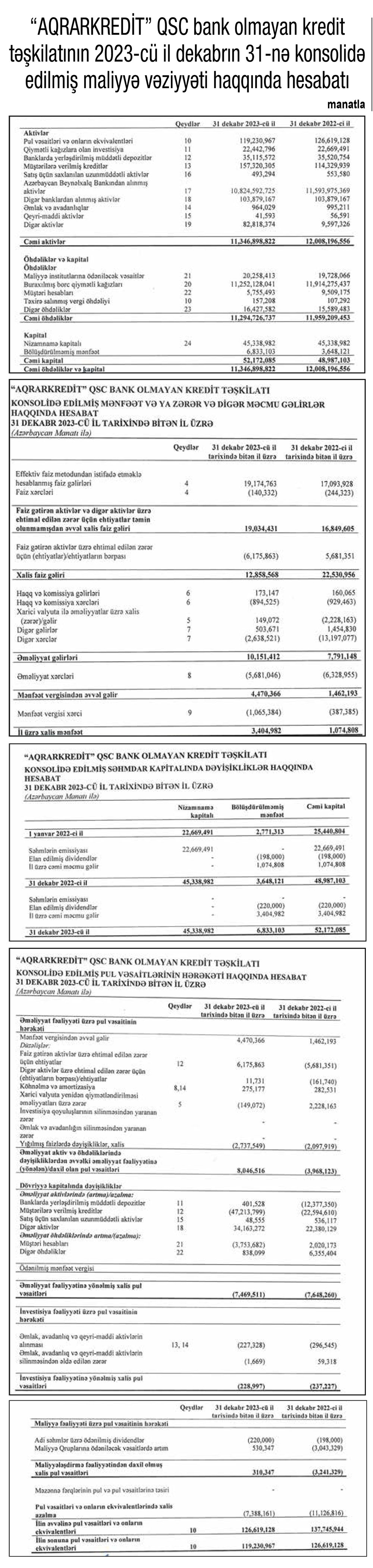 2023-cü ildə “Aqrarkredit”in kredit portfeli (müştərilərə verilmiş kreditlər) 42 milyon 990 min manat və ya 37,6% artaraq 31 dekabr 2023-cü il tarixində 157 milyon 320 min manata çatıb.