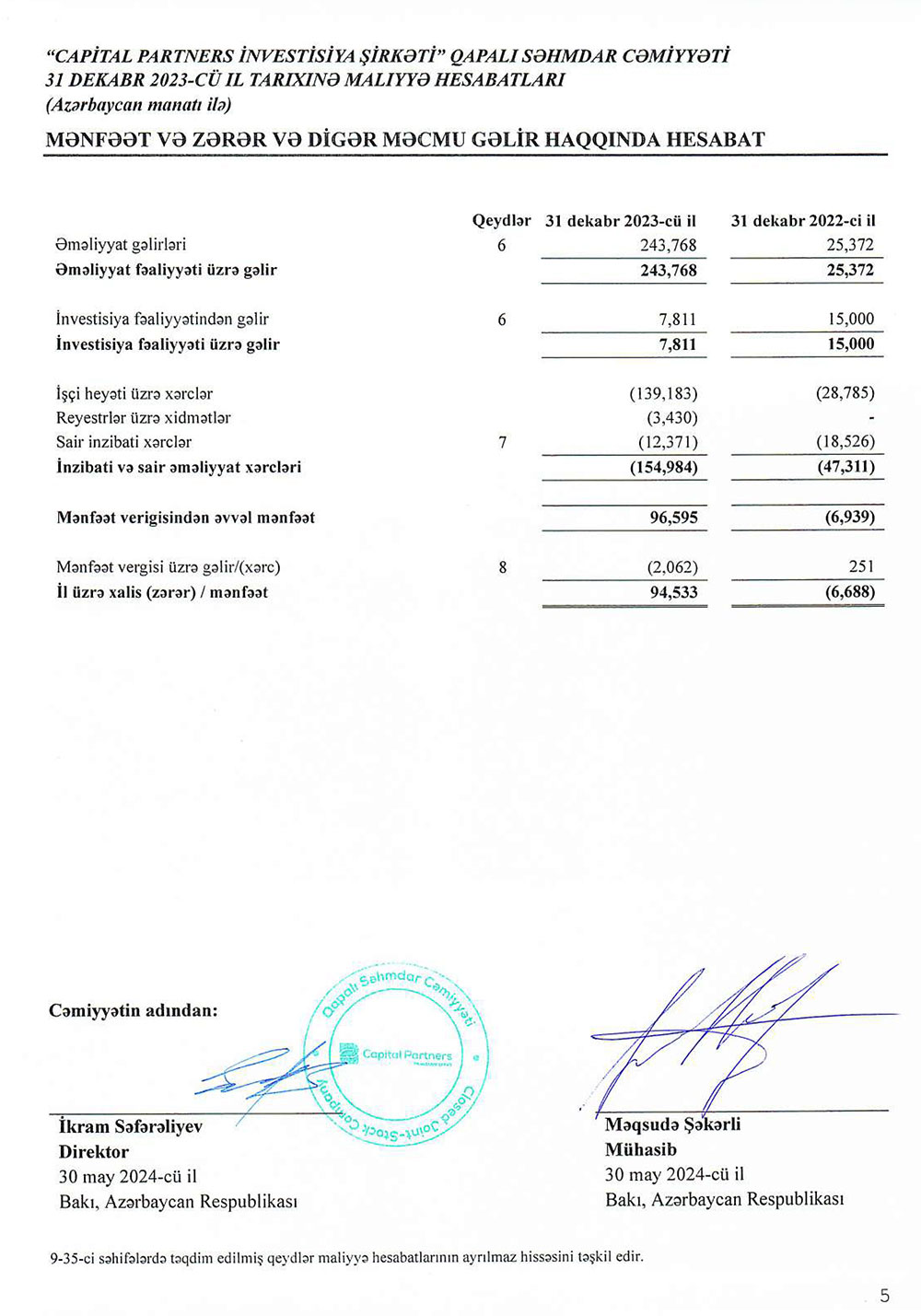 "Capital Partners İnvestisiya Şirkəti" QSC 2023-cü ili 94 min 533 manat xalis mənfəət ilə başa vurub. Şirkət 2022-ci ili 6 min 688 manat xalis zərər ilə bağlamışdı.