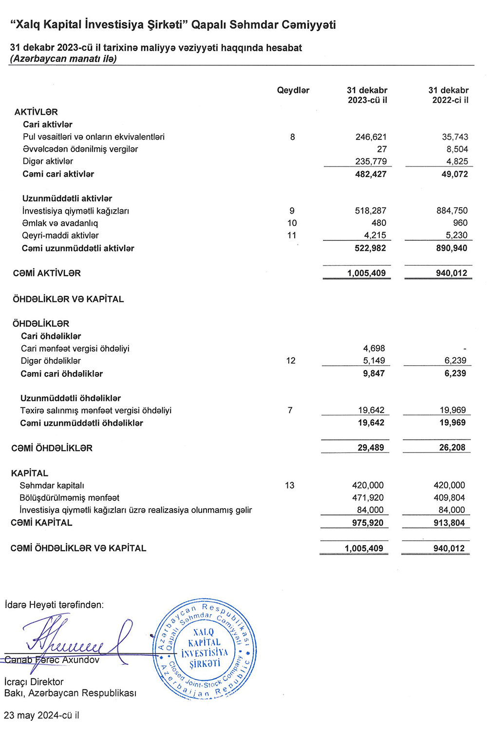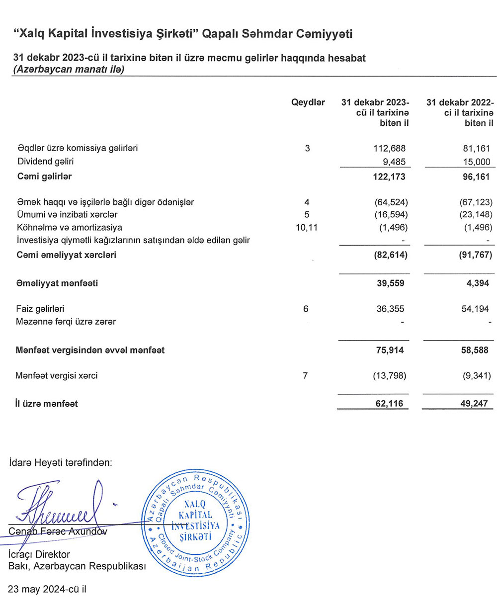 Həmçinin ötən il "Xalq Kapital" 36 min 355 manat faiz gəlirləri əldə edib (2022-ci ildə 54 min 194 manat).
