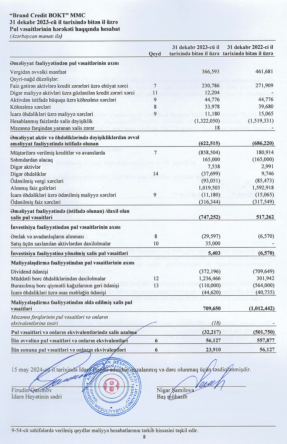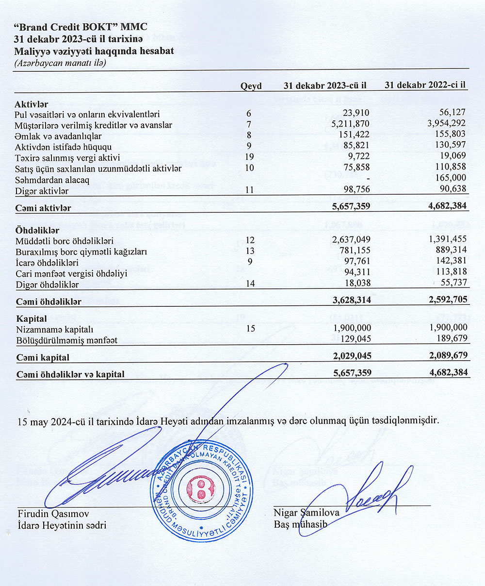 "Brand Credit Bank Olmayan Kredit Təşkilatı" MMC 31 dekabr 2023-cü il tarixində bitən il üzrə maliyyə hesabatlarını dərc edib.
