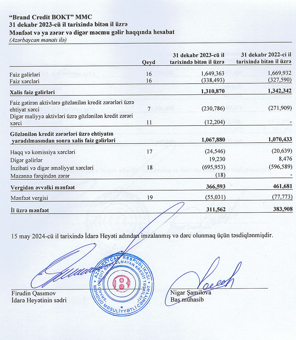 "Brand Credit BOKT"ın faiz gəlirləri 2022-ci ildə 1 milyon 670 min manat ikən, 2023-cü ilin sonunda 1 milyon 649 min manat təşkil edib.