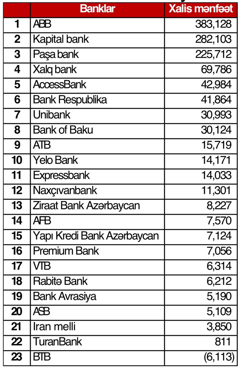 Audit olunmuş maliyyə hesabatlarına görə, ən çox xalis mənfəət əldə etmiş 5 bank - ABB, Kapital Bank, PAŞA Bank, Xalq Bank və AccessBank-dır.