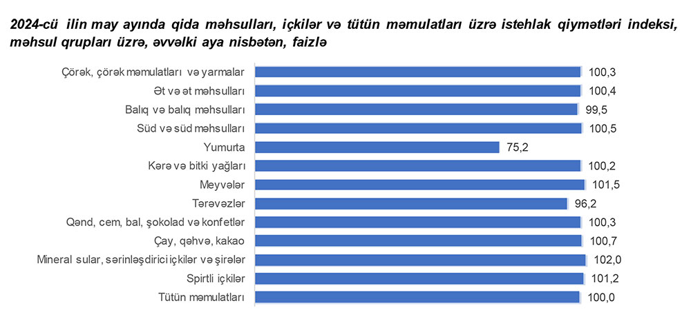2024-cü ilin may ayında qida məhsulları, içkilər və tütün məmulatları üzrə istehlak qiymətləri indeksi əvvəlki aya nisbətən 0,7 faiz, yanvar-may aylarında isə əvvəlki ilin müvafiq dövrünə nisbətən 0,8 faiz azalıb (deflyasiya).