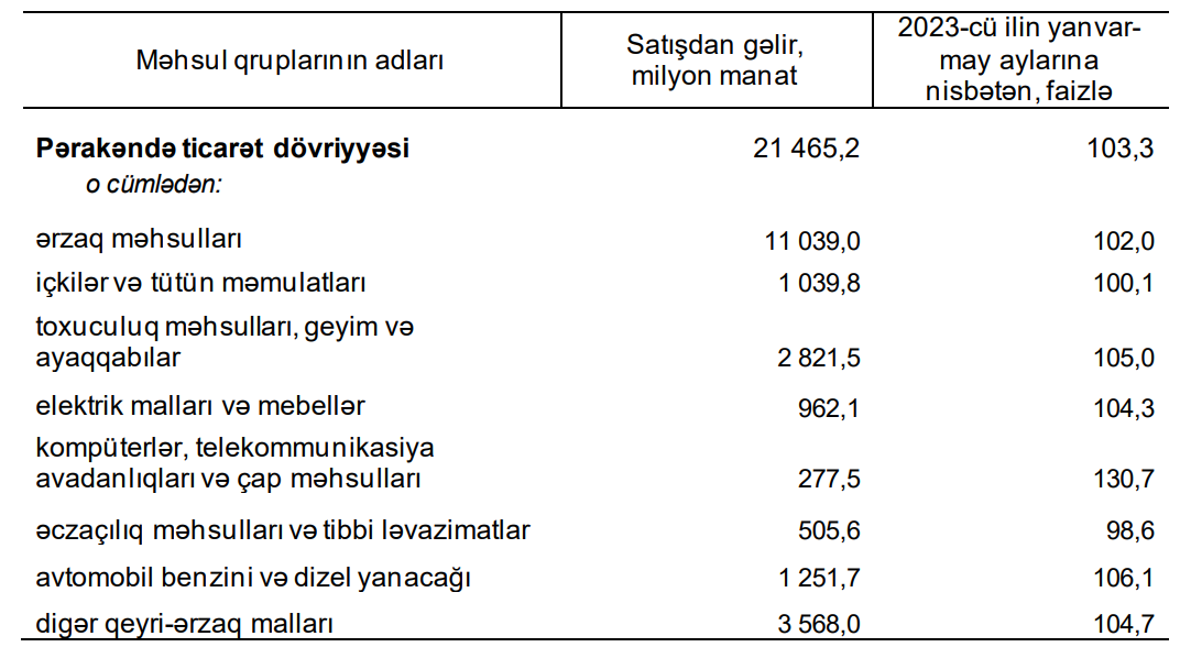 2024-cü ilin yanvar-may aylarında pərakəndə ticarət şəbəkəsində istehlakçılara 21,5 milyard manatlıq, o cümlədən 12,1 milyard manatlıq ərzaq məhsulları, içkilər və tütün məmulatları, 9,4 milyard manatlıq qeyri-ərzaq malları satılmışdır.