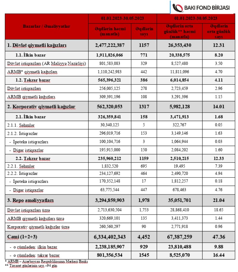 Bakı Fond Birjasında 2024-cü ilin yanvar-may ayları ərzində qiymətli kağızlar üzrə keçirilən əməliyyatların ümumi həcmi 14 milyard 686 milyon 648 min 891 manat təşkil etmişdir. Birjasda 2023-cü ilin yanvar-may ayları ərzində qiymətli kağızlar üzrə keçirilən əməliyyatların ümumi həcmi 6 milyard 334 milyon 402 min 343 manat təşkil etmişdi.