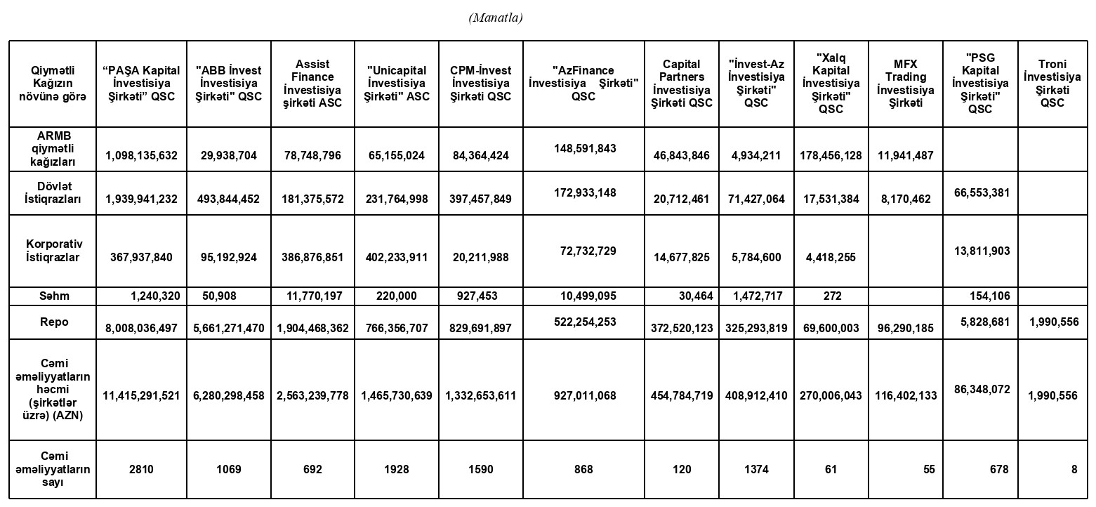 Marja.az Birjaya istinadən xəbər verir ki, 2024-cü ilin yanvar-may ayları üzrə "PAŞA Kapital İnvestisiya Şirkəti” QSC 11 milyard 415 milyon 291 min 521 manat dövriyyə ilə 1-ci, "ABB İnvest İnvestisiya Şirkəti" QSC 6 milyard 280 milyon 298 min 458 manat dövriyyə ilə 2-ci, "Assist Finance İnvestisiya Şirkəti" ASC 2 milyard 563 milyon 239 min 778 manat dövriyyə ilə 3-cü olub.