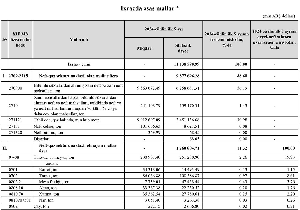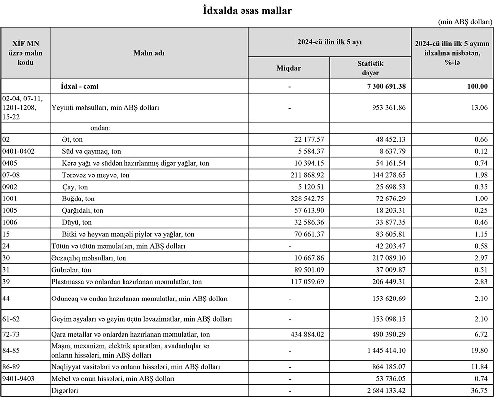 2024-cü ilin yanvar-may aylarında (ilk 5 ayda) Azərbaycanın ən çox ixrac və idxal etdiyi mallar.