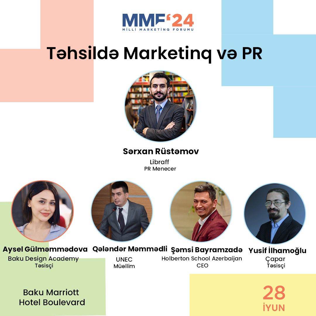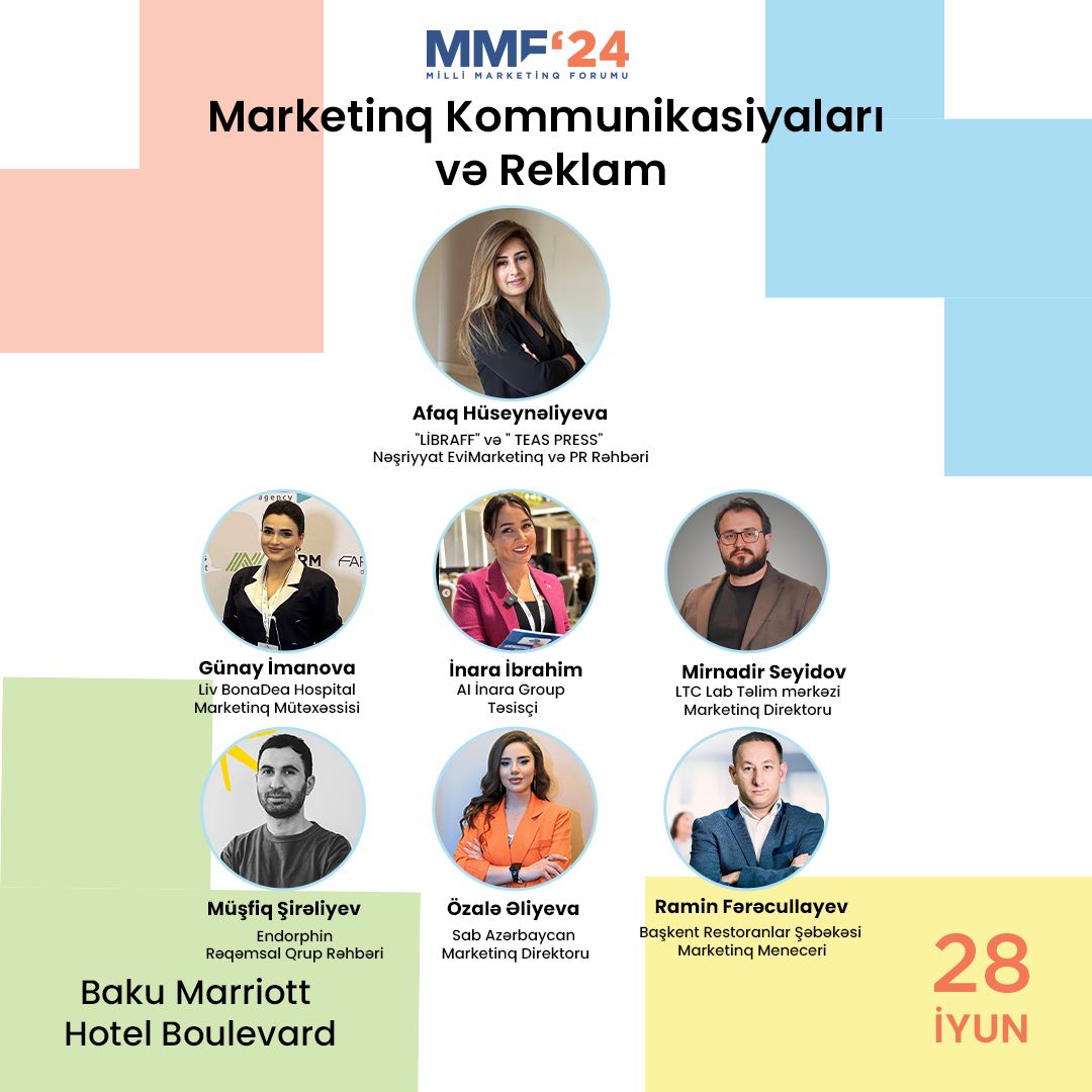 “Marketinq Kommunikasiyaları və Reklam” paneli "LİBRAFF" və "TEAS PRESS" Nəşriyyat Evinin Marketinq və PR Rəhbəri Afaq Hüseynəliyevanın moderatorluğu ilə keçiriləcək. “LİV Bona Dea Hospital”ın marketinq mütəxəssisi Günay İmanova, “AI İnara Group”un təsisçisi İnara İbrahim, “Endorphin” agentliyinin rəqəmsal qrup rəhbəri Müşfiq Şirəliyev, “LTC Lab” şirkətinin marketinq direktoru Mirnadir Seyidzadə, “Sab Azərbaycan” şirkətinin marketinq direktoru Özalə Əliyeva və “Başkent” Restoranlar Şəbəkəsinin marketinq direktoru Ramin Fərəcullayev spiker qismində çıxış edəcəklər.