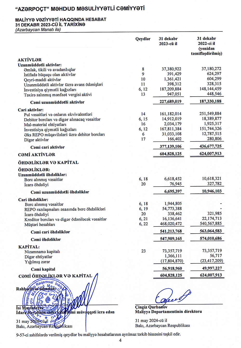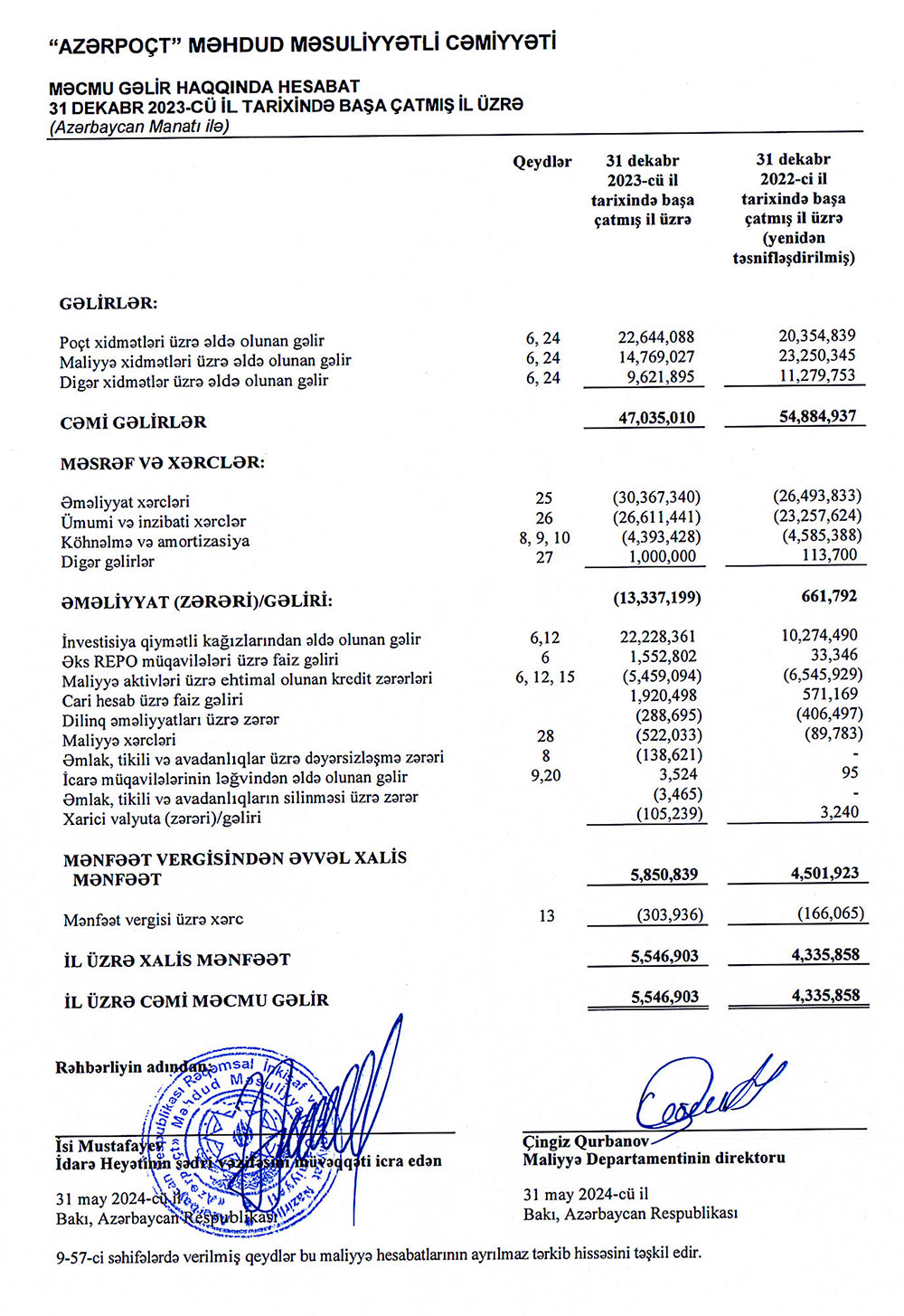 Ötən il "Azərpoçt" MMC investisiya qiymətli kağızlarından əldə etdiyi 22 milyon 228 min manat və əks-repo ənəliyyatlarından əldə etdiyi 1 milyon 553 min manat gəlirlər Şirkətin əməliyyat zərərini və digər xərclərini bağlayıb və ili mənfəətlə başa vurmasını təmin edib. "Azərpoçt" MMC 2022-ci ildə investisiya qiymətli kağızlarından 10 milyon 274 min manat, əks-repo müqavilələri üzrə 33 min manat gəlir əldə etmişdi.