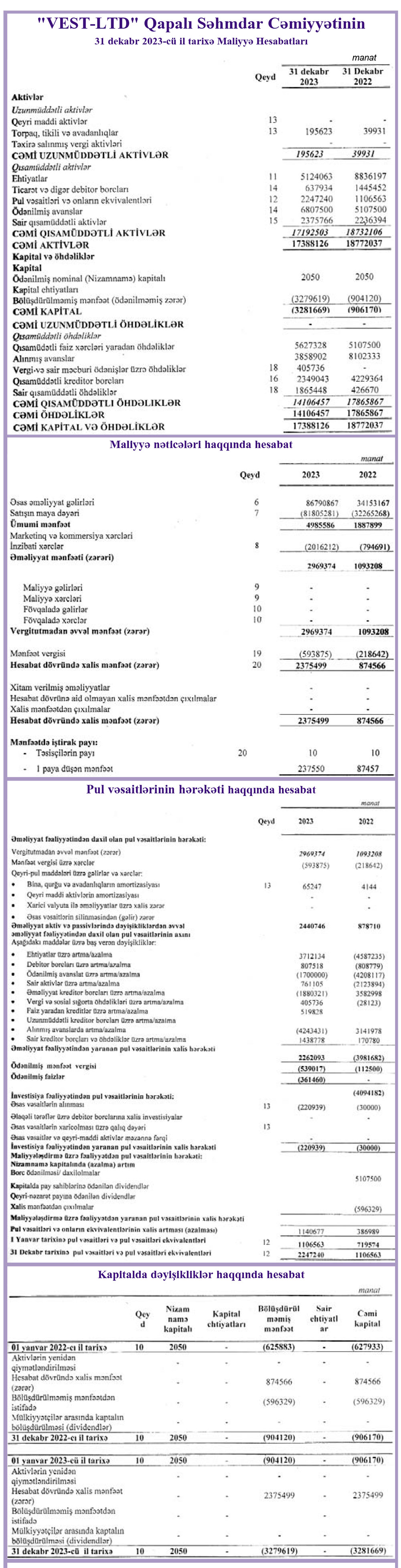Marja.az xəbər verir ki, "Vest LTD"nin cəmi gəlirləri 2022-ci ildə 34 milyon 153 min manat ikən, 2023-cü ildə 86 milyon 791 min manata yüksəlib (2,5 dəfə artıb).