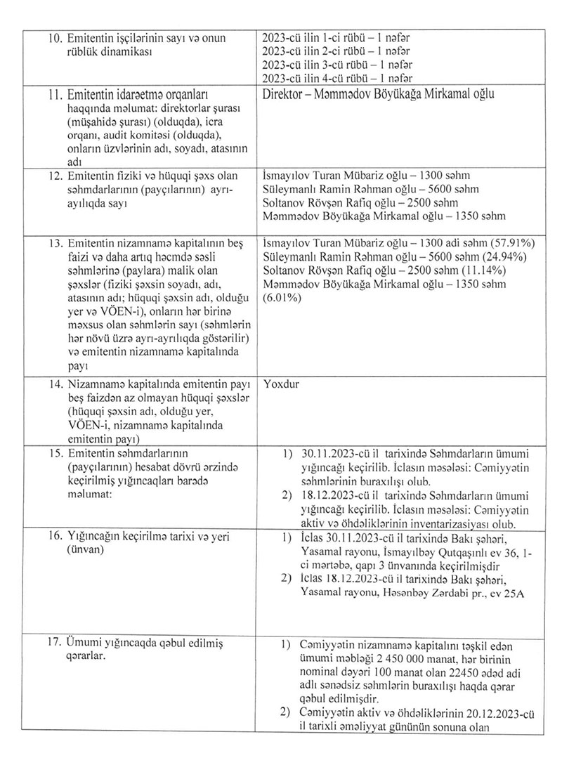 31 dekabr 2023-cü il tarixində "Legion Financial" ASC-nin səhmdarları İsmayılov Turan Mübariz oğlu (57,91%), Süleymanlı Ramin Rəhman oğlu (24,94%), Soltanov Rövşən Rafiq oğlu (11,14%) və Məmmədov Böyükağa Mirkamal oğlu (6,01%) olub.