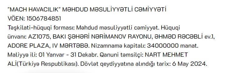 Nizamnamə kapitalı 34 milyon manat olan "MACH HAVACILIK" MMC-nin qanuni təmsilçi NART MEHMET ALİ-dir (Türkiyə Respublikası vətəndaşı).