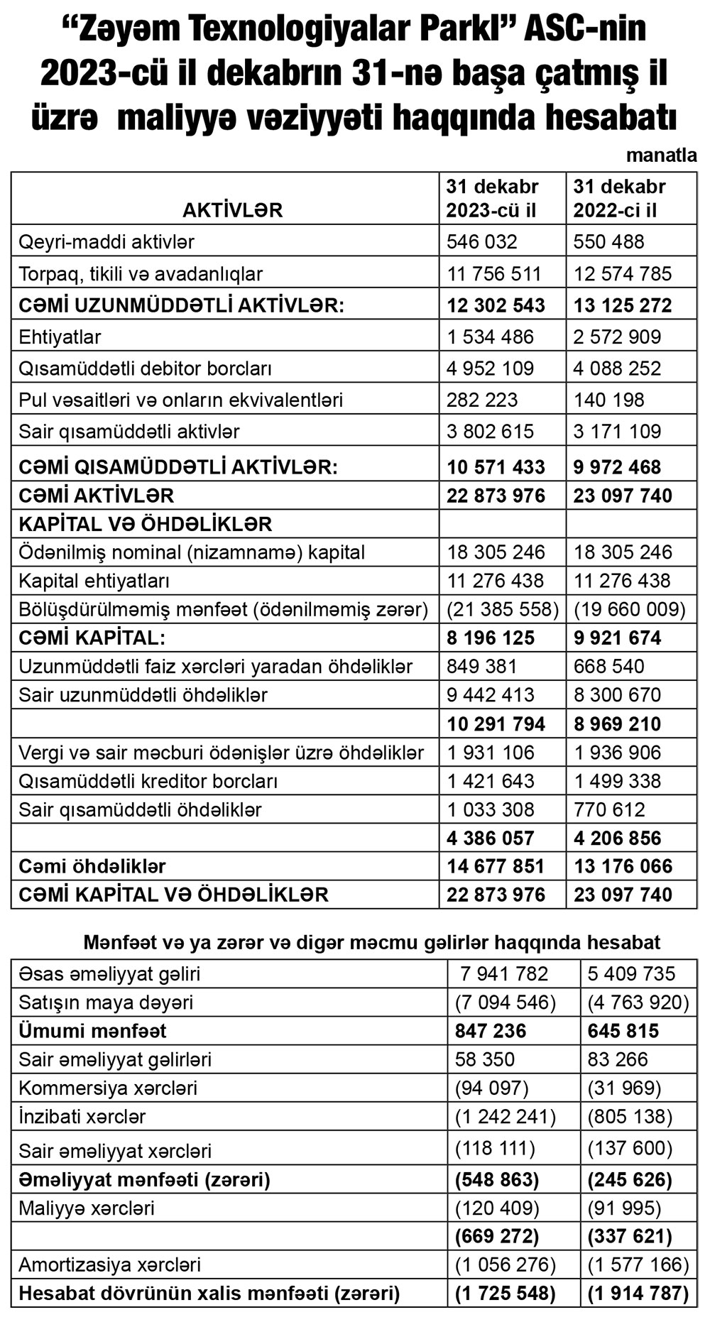 “Zəyəm Texnologiyalar Parkı” ASC 2023-cü ili 1 milyon 726 min manat xalis zərər ilə başa vurub. Şirkət 2022-ci ili 1 milyon 915 min manat xalis zərər ilə bağlamışdı. Beləliklə, ötən il “Zəyəm Texnologiyalar Parkı”nın xalis zərəri 189 min manat və ya 9,9% azalıb. Xalis zərərin azalması əsas əməliyyat gəlirinin artması ilə bərabər, amortizasiya xərclərinin də düşməsilə bağlıdır.