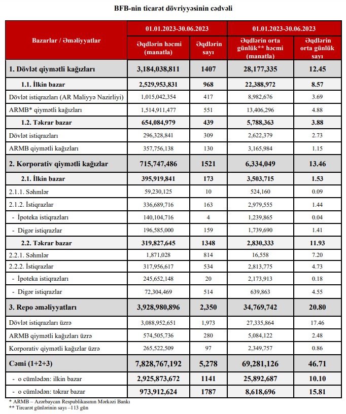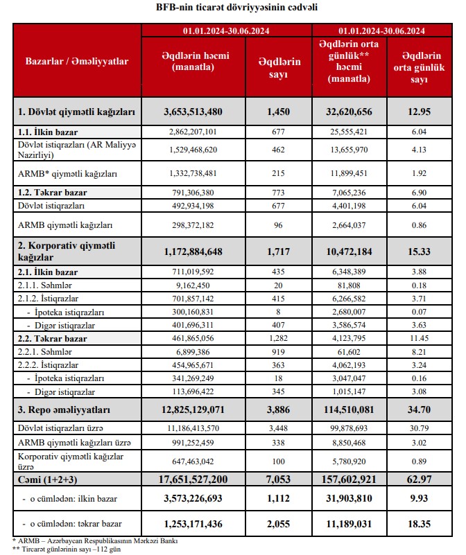 2024-cü ilin yanvar-iyun ayları ərzində Bakı Fond Birjasında (BFB) qiymətli kağızlar üzrə keçirilən əməliyyatların ümumi həcmi 17 milyard 651 milyon 527 min manat təşkil etmişdir. Birjada 2023-cü ilin yanvar-iyun ayları ərzində qiymətli kağızlar üzrə keçirilən əməliyyatların ümumi həcmi 7 milyard 828 milyon 767 min manat təşkil etmişdi. Beləliklə, Birjanın dövriyyəsi 2024-cü ilin 1-ci yarısında ötən ilin eyni dövrü ilə müqayisədə 2,3 dəfə artıb.