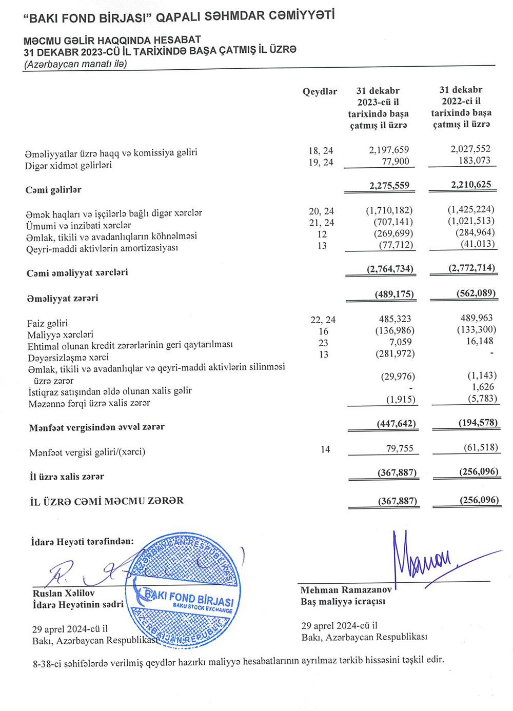 "Bakı Fond Birjası" QSC 2023-cü ili 368 min manat xalis zərər ilə başa vurub. Birja 2022-ci ili 256 min manat xalis zərər ilə bağlamışdı. Beləliklə, ötən il "Bakı Fond Birjası"nın xalis zərəri 112 min manat və ya 43,8% artıb.