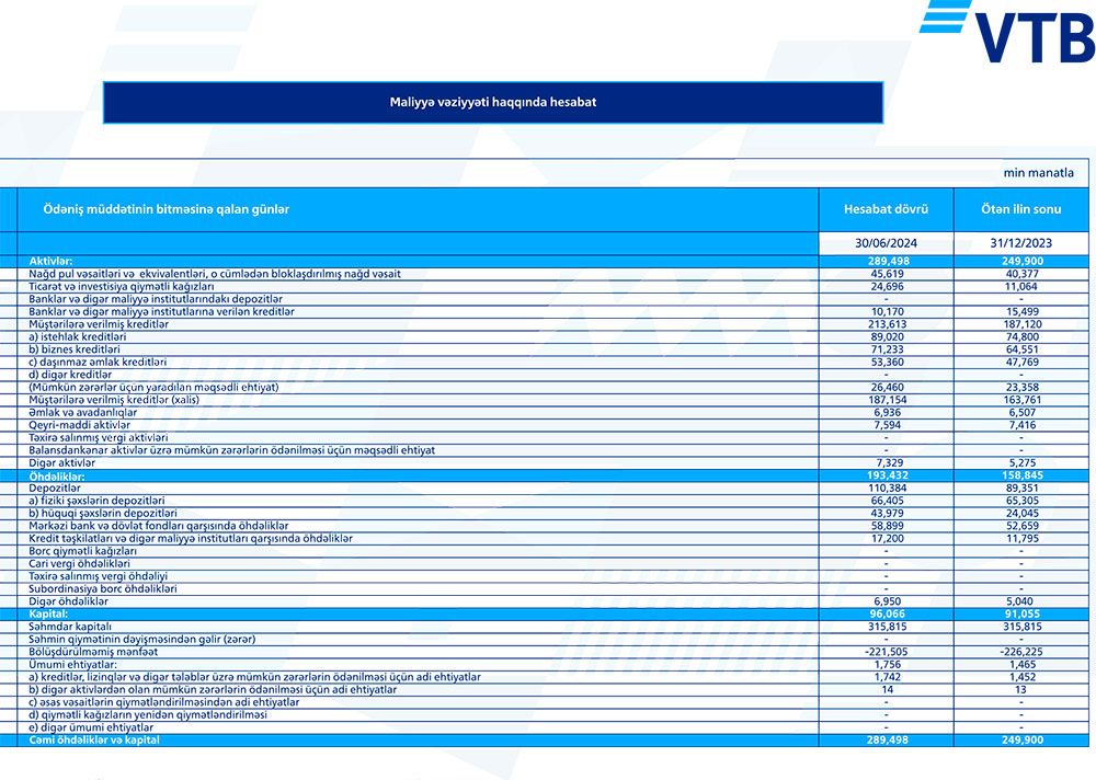 2024-cü ilin ilk 6 ayında (yanvar-iyun) "Bank VTB (Azərbaycan)" ASC-nin kredit portfeli (müştərilərə verilmiş cəmi kreditlət) 26 milyon 493 min manat və ya 14,2% artaraq 213 milyon 613 min manata çatıb. Bank ötən ilin sonunda 187 milyon 120 min manat kredit portfelinə malik idi.