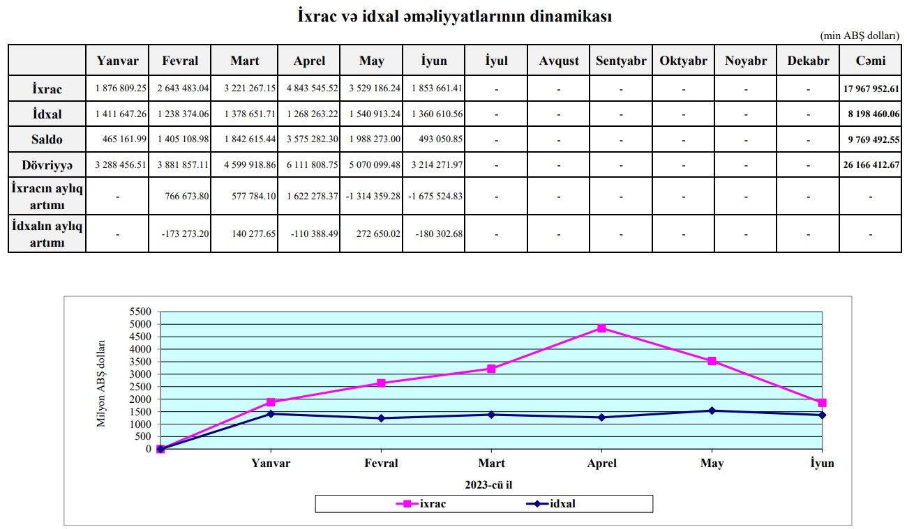 Müqayisə üçün qeyd edək ki, 2023-cü ilin ilk yarısında (yanvar-iyun) Azərbaycanın xarici ticarət əməliyyatlarının həcmi 26 milyard 166 milyon 413 min ABŞ dolları, ixrac 17 milyard 967 milyon 953 min ABŞ dolları, idxal 8 milyard 198 milyon 460 min ABŞ dolları, müsbət saldo 9 milyard 769 milyon 492 min ABŞ dolları olmuşdu.