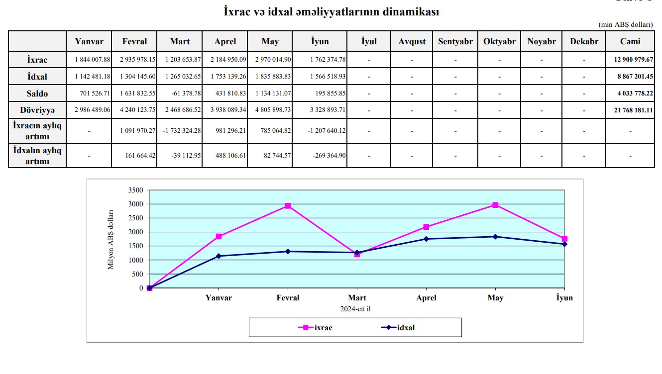 Azərbaycanın ixracı azalıb, idxalı artıb. Bu səbəbdən saldo kiçilib.2024-cü ilin ilk yarısında (yanvar-iyun) Azərbaycanın xarici ticarət əməliyyatlarının həcmi 21 milyard 768 milyon 181 min ABŞ dolları təşkil edib.