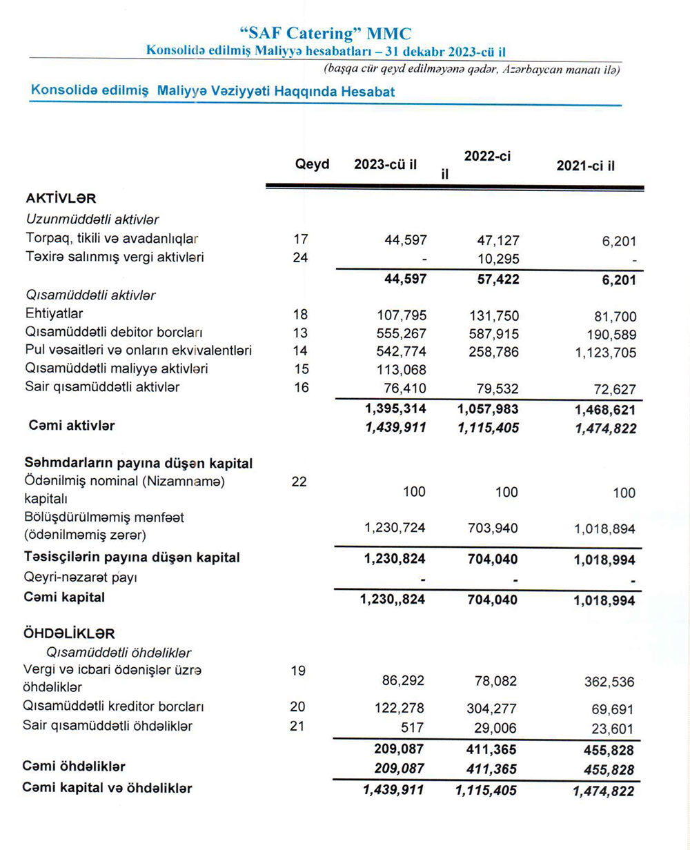 "SAF Catering" MMC 31 dekabr 2023-cü il tarixində 1 milyon 440 min manat cəmi aktivlərə malik olub. Şirkət 2022-ci ilin sonunda 1 milyon 115 min manat cəmi aktivlər əmalik idi.
