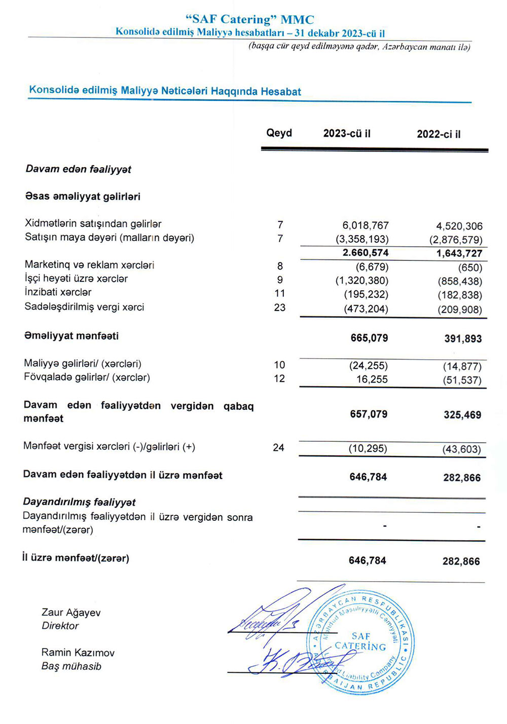 "SAF Catering" MMC 2023-cü ili 647 min manat xalis mənfəət ilə başa vurub. Şirkət 2022-ci ili 283 min manat xalis mənfəət ilə bağlamışdı. Beləliklə, "Saf Catering" şirkətinin xalis mənfəəti 2023-cü ildə 2022-ci illə müqayisədə 2,3 dəfə artıb. Xalis mənfəətin artması gəlirin artmasından qaynaqlanır.