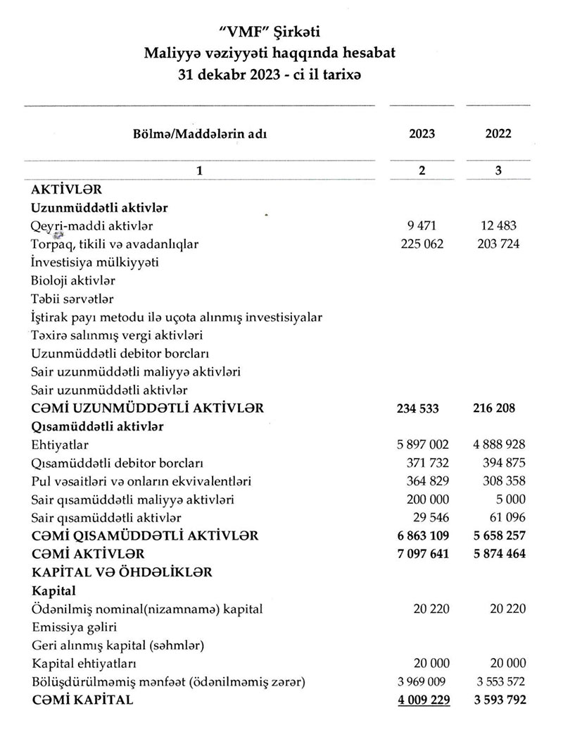 31 dekabr 2023-cü il tarixində "VMF" şirkəti 7 milyon 98 min manat cəmi aktivlər əmalik olub. Şirkət 2022-ci ilin sonunda 5 milyon 874 min manat cəmi aktivlərə malik idi.