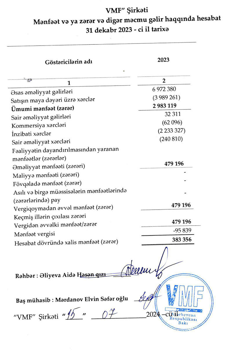 Saatların, zərgərlik məmulatlarının topdan və pərakəndə satışı, həmçinin onlara servis xidmətlərinin göstərilməsi fəaliyyətləri ilə məşğul olan "VMF" şirkəti 2023-cü ili 383 min manat xalis mənfəət ilə başa vurub. Şirkət 2022-ci ili 426 min manat xalis mənfəət ilə bağlamışdı. Beləliklə, "VMF" şirkətinin xalis mənfəəti 2023-cü ildə 2022-ci illə müqayisədə 43 min manat və ya 10% azalıb. Şirkət 2020-ci ildə 607 min manat, 2021-ci ildə isə 463 min manat xalis mənfəət əldə etmişdi.
