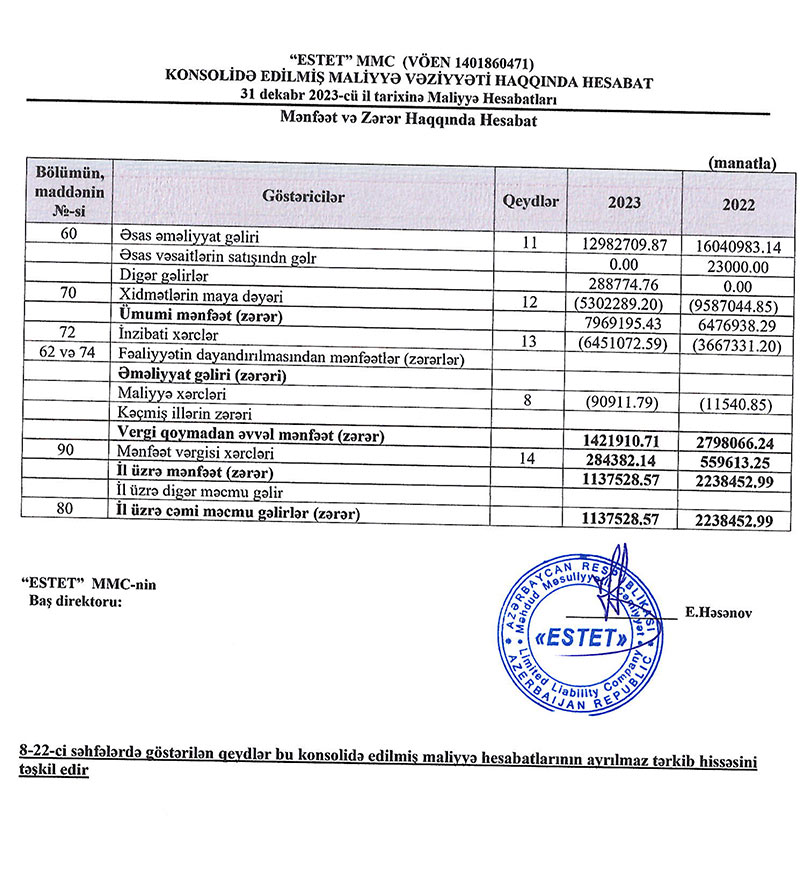 Marja.az Şirkətin 31 dekabr 2023-cü il tarixində konsolidə edilmiş maliyyə vəziyyəti haqqında hesabatlarına istinadən xəbər verir ki, "Estet" MMC-nin əsas əməliyyat gəliri 2022-ci ildə 16 milyon 41 min manat ikən, 2023-cü ildə 12 milyon 983 min manata düşüb (3 miylon 58 min manat və ya 19% azalıb). Ötən il Şirkət 289 min manat digər gəlirlər də əldə edib.