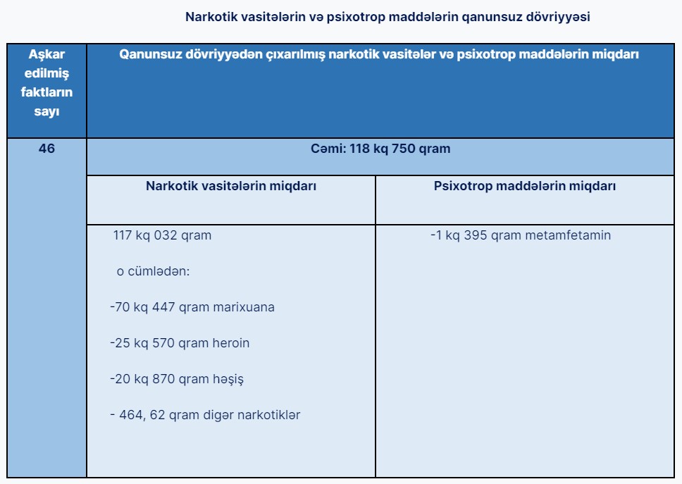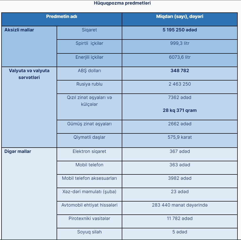 Qeyd olunan dövr ərzində qabaqcadan əlbir olan bir qrup şəxs və ya mütəşəkkil dəstə tərəfindən qızıl məmulatlarının, iri vergi tutumlu aksizli və digər bu qəbildən olan malların qanunsuz gətirilməsi üzrə törədilmiş bir sıra cinayətlərin qarşısı alınmış, onların istifadə etdiyi qaçaqmalçılıq kanalları aşkar olunaraq zərərsizləşdirilmişdir.